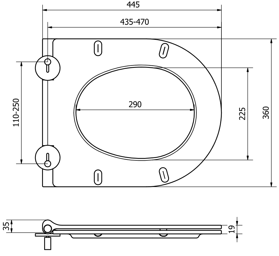 Komplekte yra tvirti metaliniai vyriai, kurie garantuoja stabilų lentos pritvirtinimą prie tualeto dubenėlio. Tai yra praktinis sprendimas, leidžiantis lengvai pritaikyti lentą pagal tualeto formą ir matmenis, užtikrinant patogumą naudoti.