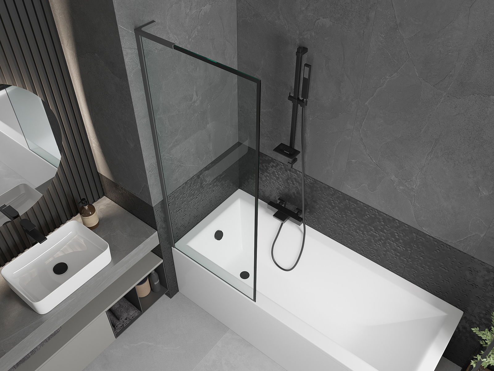 Efektyvi apsauga nuo vandens išsiliejimo maudymosi metu. Sienelė turi tarpines, kurios idealiai priglunda prie stiklo paviršiaus ir vonios krašto. Funkcionalus sprendimas, užtikrinantis saugumą ir lengvą švaros palaikymą.
