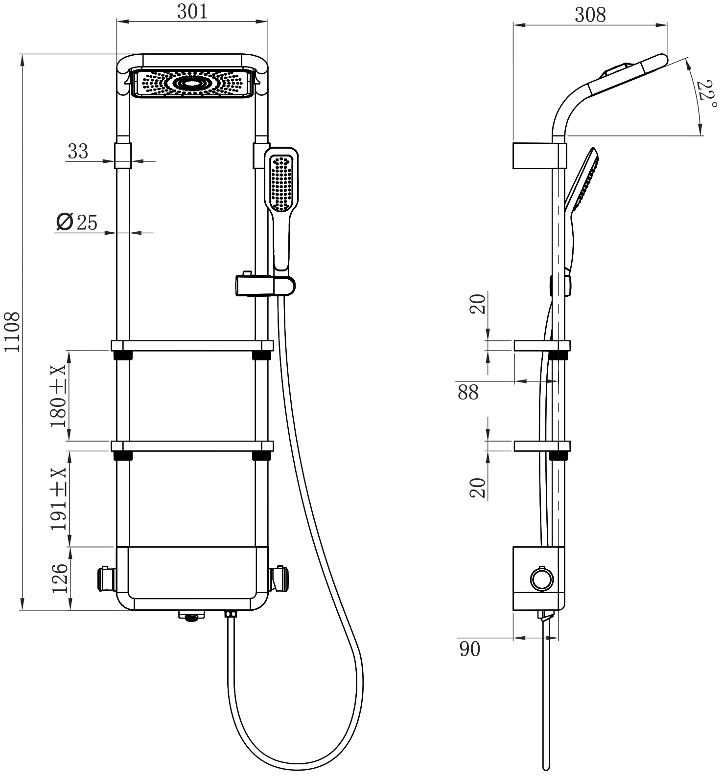 Srovė, kylanti iš dušo galvutės, imituoja natūralų lietų. Ji užtikrina, kad vandens lašai tolygiai kristų ant viso kūno, nuplautų naudojamus kosmetikos produktus ir sumažintų stresą bei raumenų įtampą. Kasdienis poilsis harmonijoje su gamta.