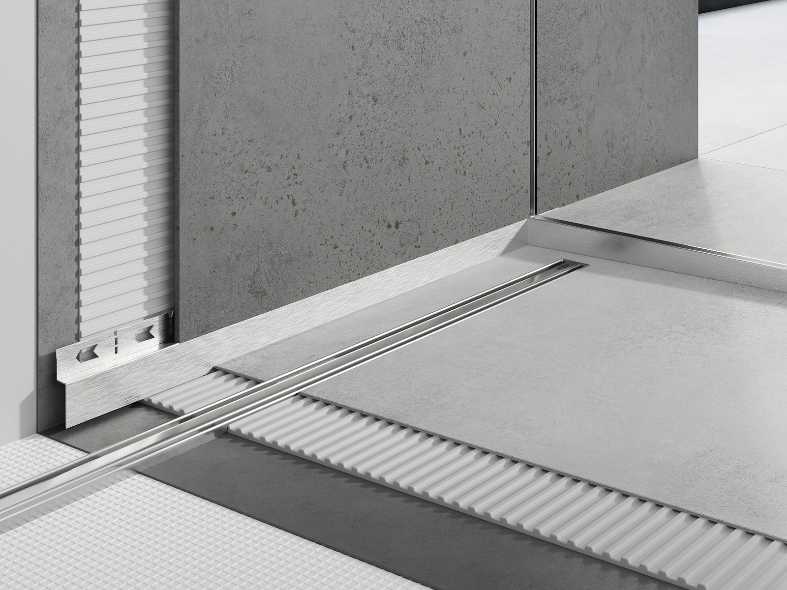 Priekinė juosta kompletuojama su nuolydžio juostomis, sukurdama vientisą vaizdą dušo erdvėje