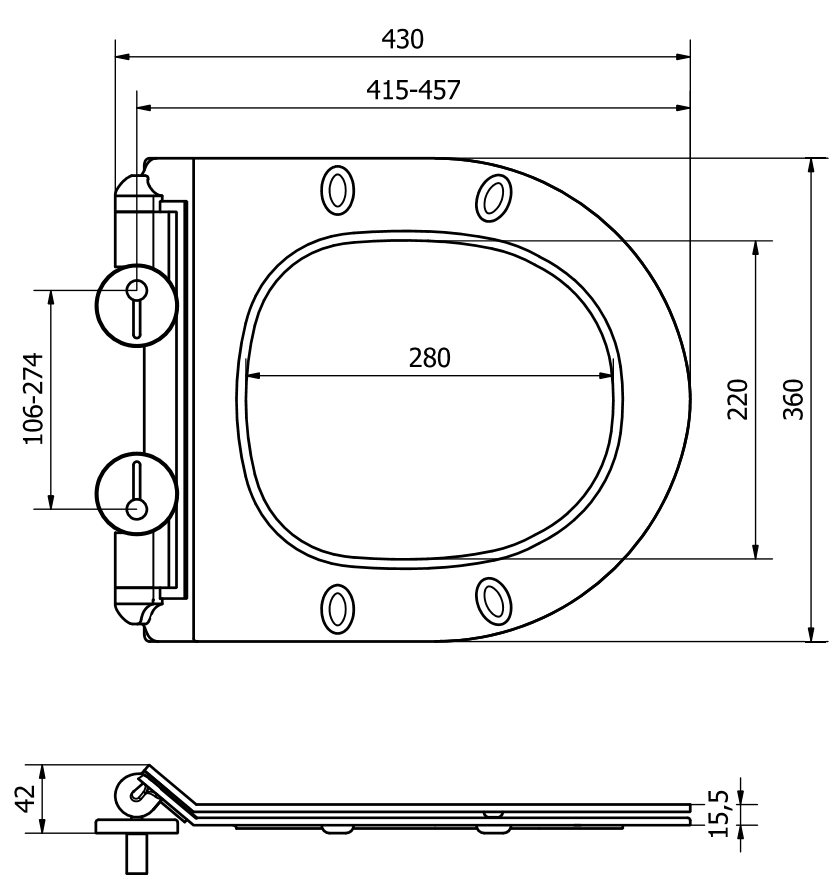 Komplekte yra tvirti metaliniai vyriai, kurie užtikrina stabilų dangčio pritvirtinimą prie WC lėkštės. Tai praktiškas sprendimas, leidžiantis lengvai pritaikyti dangtį prie tualeto formos ir matmenų, užtikrinant naudojimo patogumą.