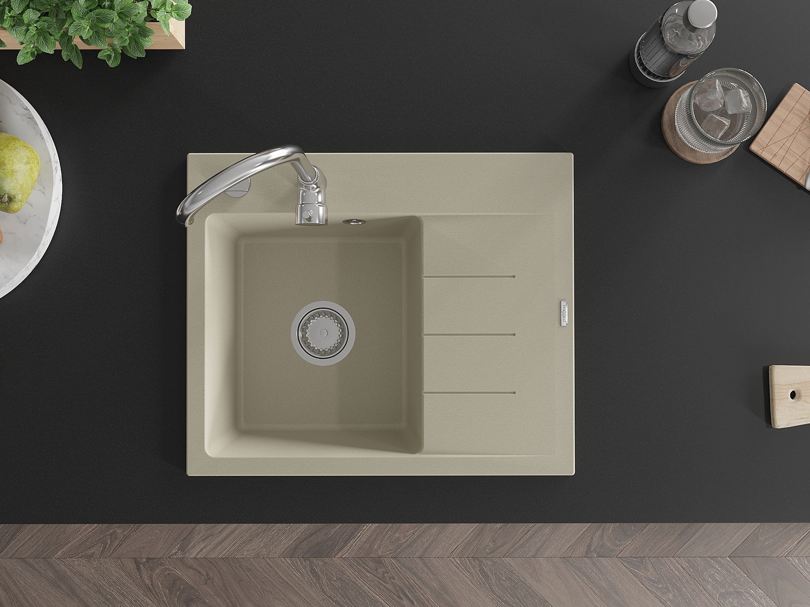 Mexen Ben granitinė vienos kameros plautuvė su nusausintuvu, kairė 600 x 500 mm, smėlinė, chromuotas sifonas
