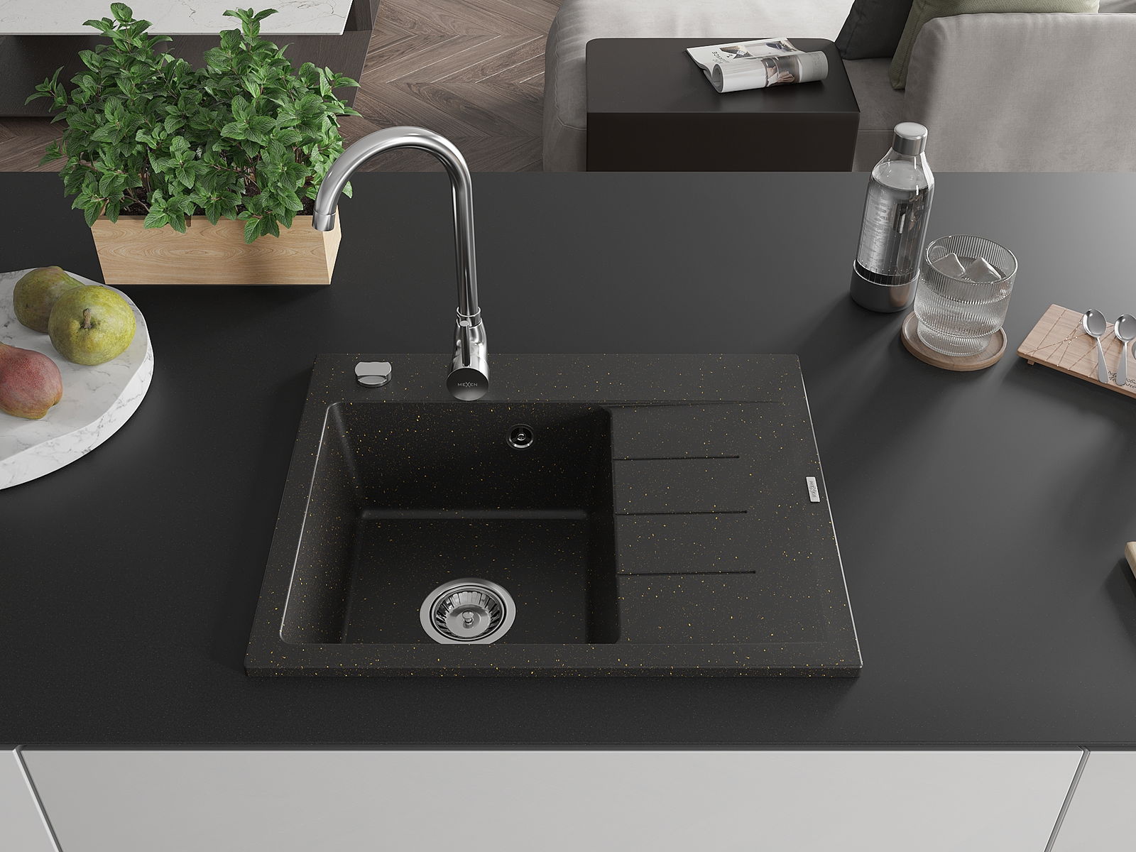 Mexen Ben granitinė virtuvės kriauklė su vienu dubeniu ir nutekėjimu, kairysis 600 x 500 mm, juoda/auksinė metalo spalva,