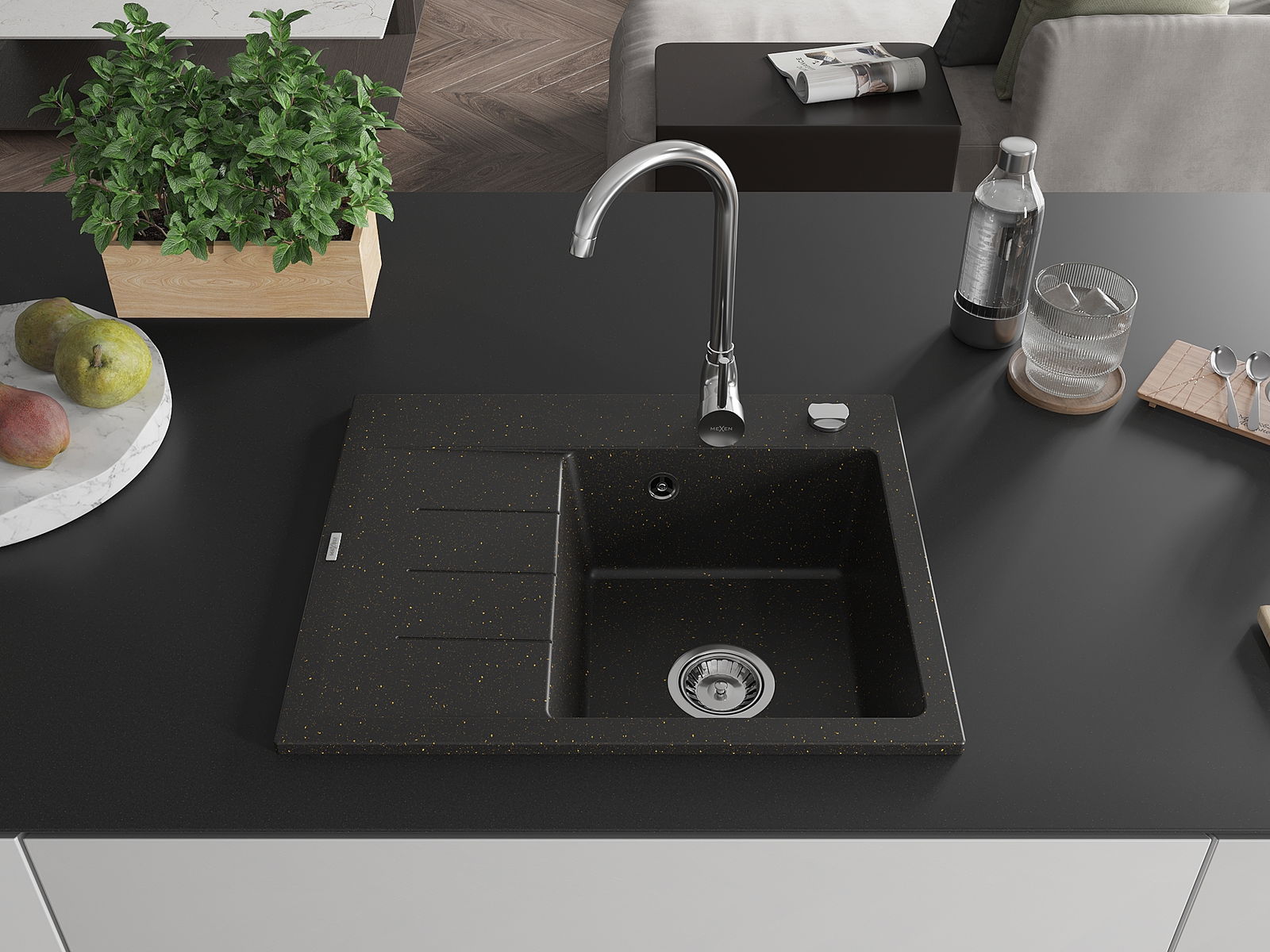 Mexen Ben granitinė plautuvė su viena kamera ir nutekėjimu, dešinysis 600 x 500 mm, juoda/auksinė metalo, chromuotas