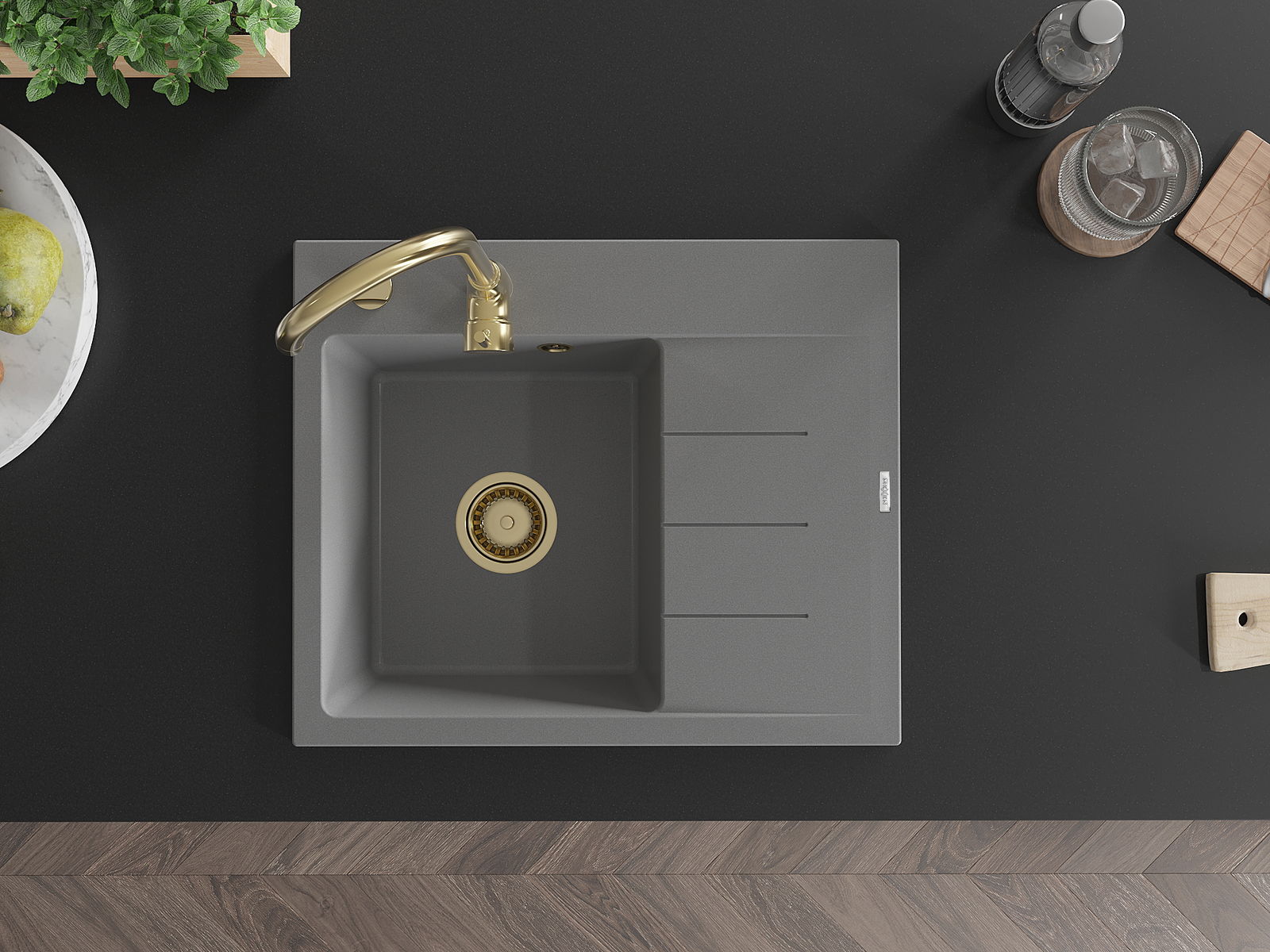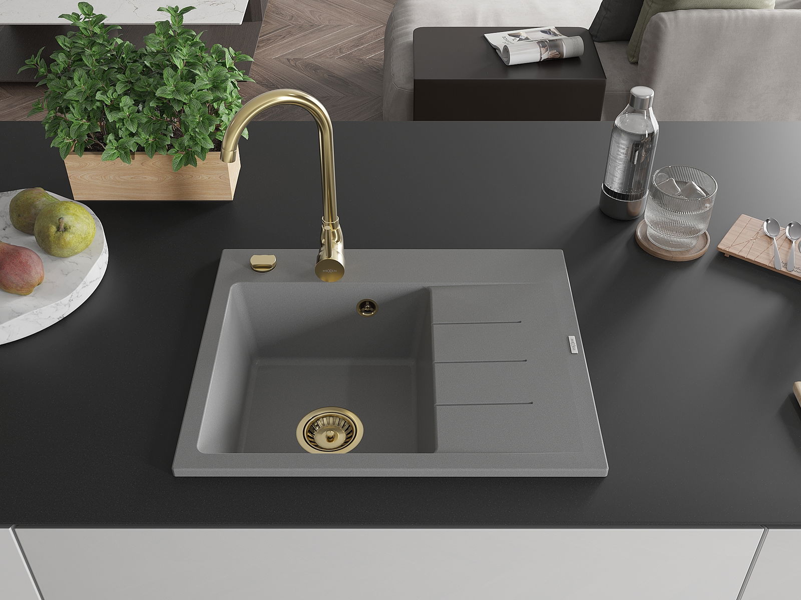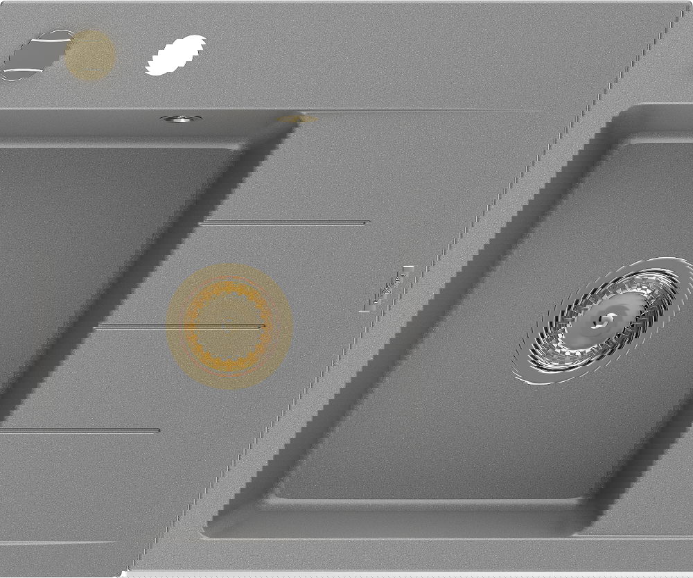 Mexen Ben vieno dubens granitinė plautuvė su nusausintuvu, kairė, 600 x 500 mm, pilka, aukso sifonas - 6522605000-71-G