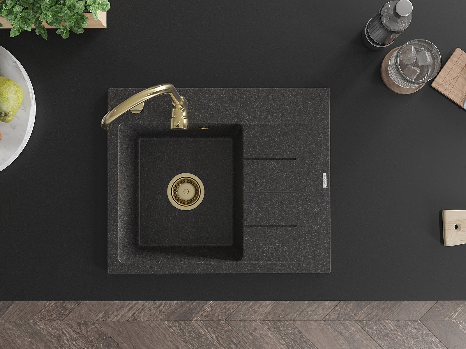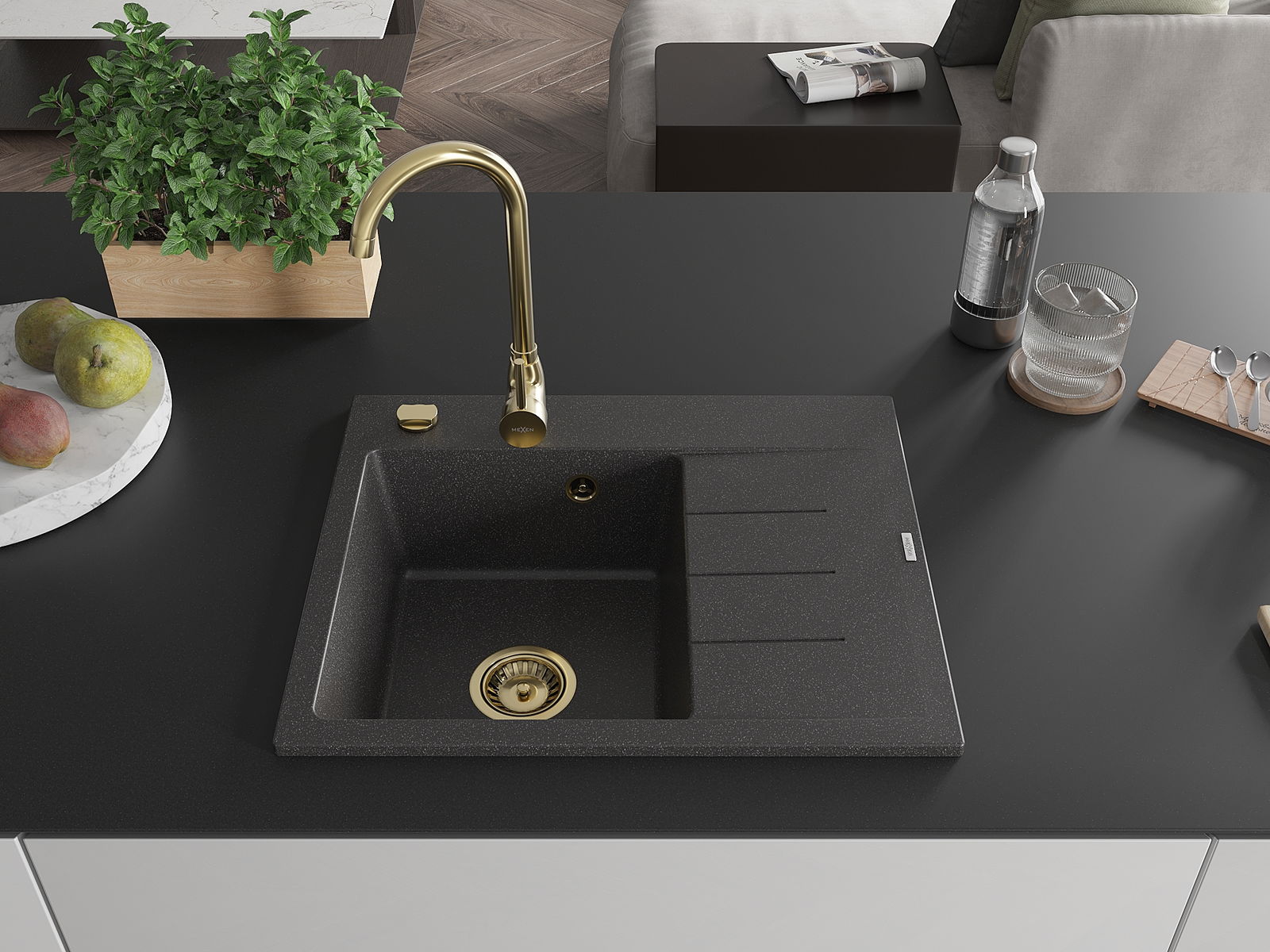Mexen Ben granitinė plautuvė su viena kamera ir lašintuvu, kairė 600 x 500 mm, juoda dėmėta, auksinis sifonas