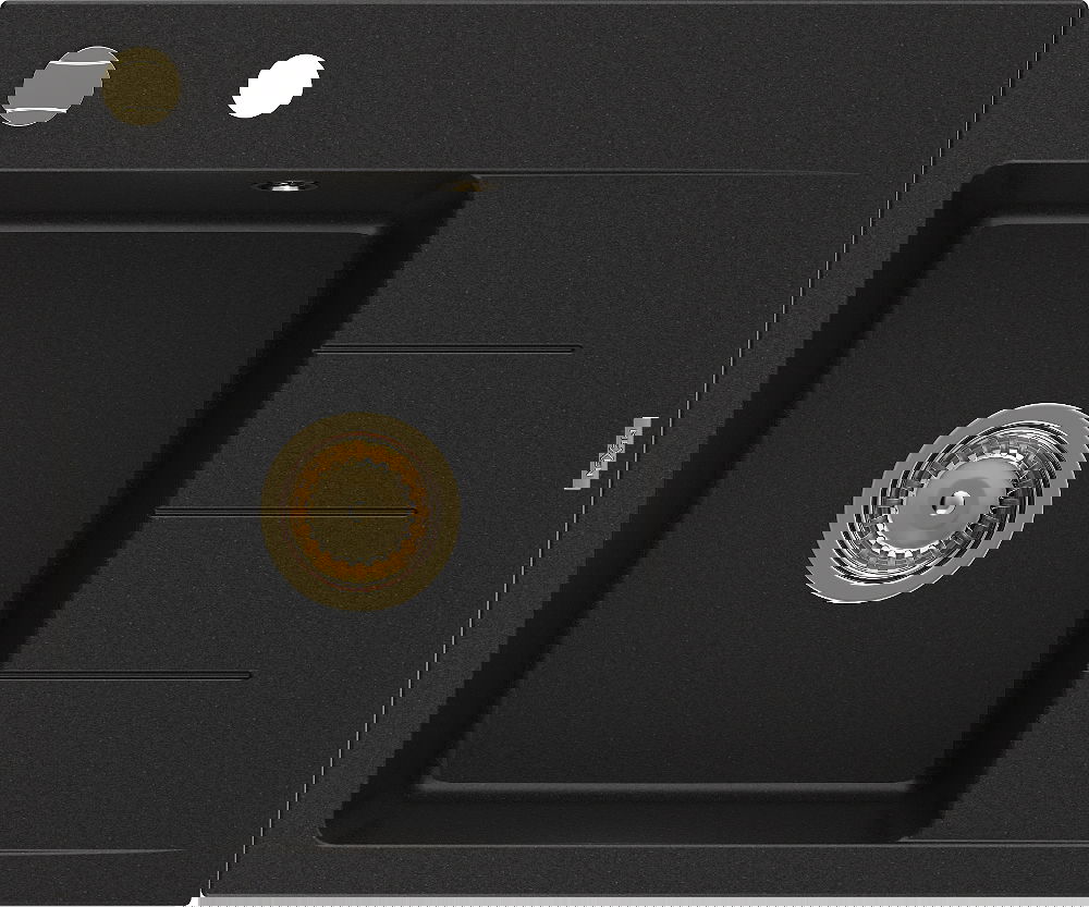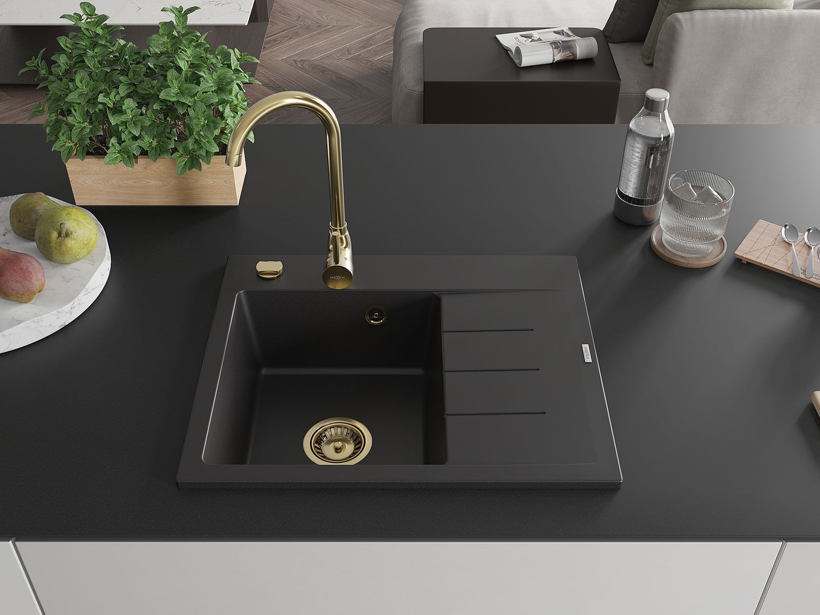 Mexen Ben granitinė vienos plautuvės kriauklė su nusausintuvu, kairė, 600 x 500 mm, juoda, sifonas auksinis