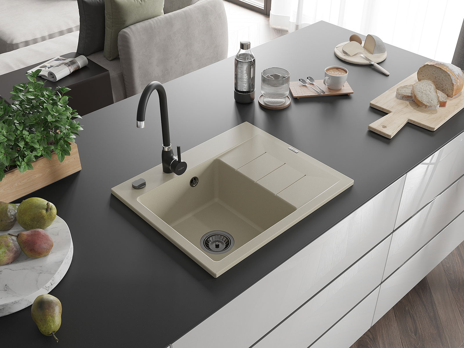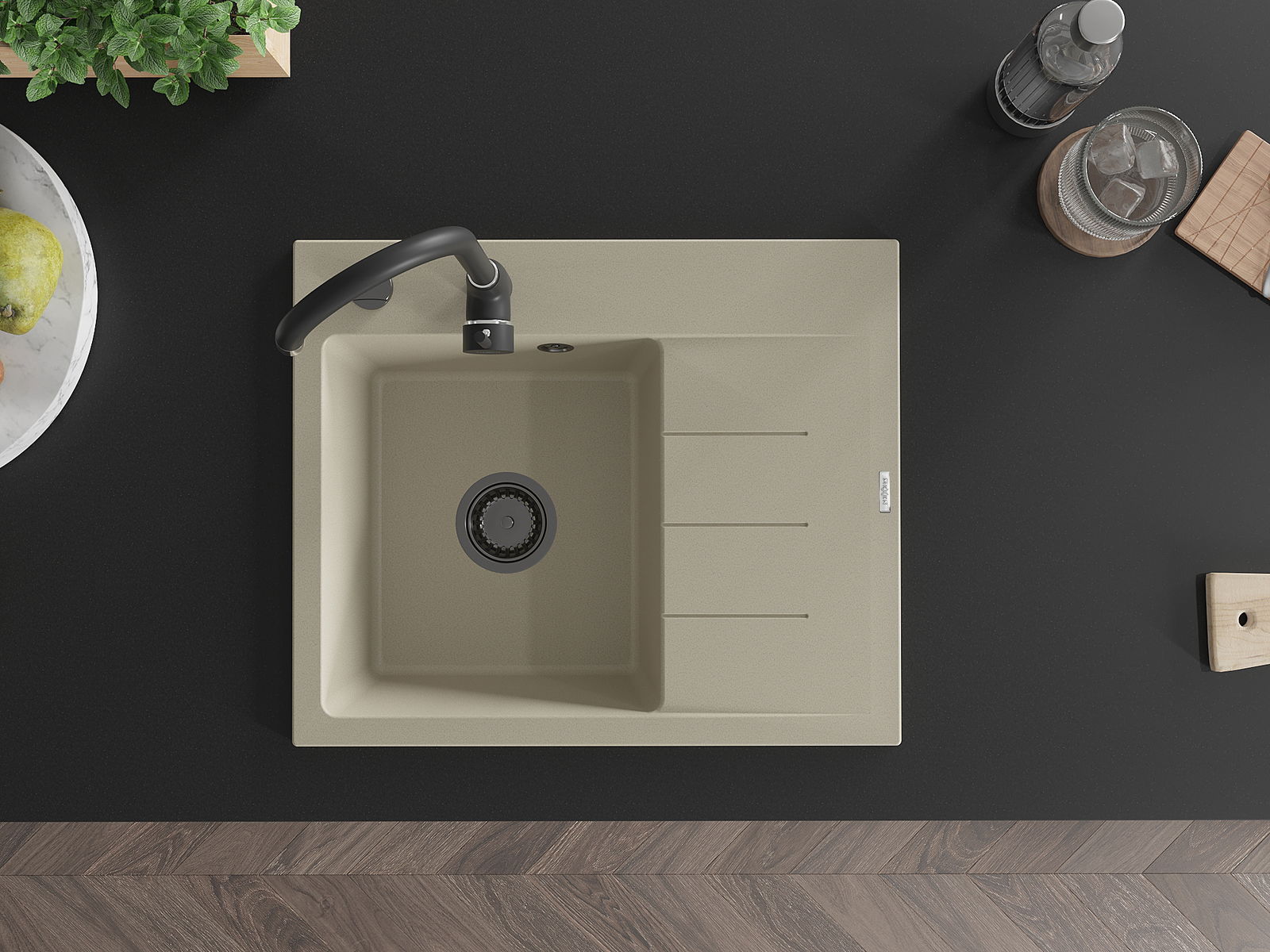 Mexen Ben granitinė plautuvė su viena kamera ir lašeline, kairė 600 x 500 mm, smėlio spalvos, juodas sifonas