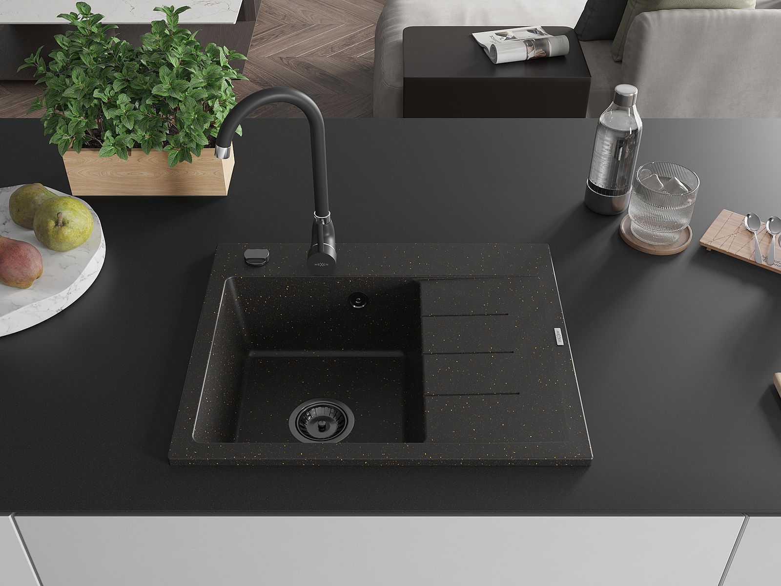 Mexen Ben granitinė vienos sekcijos virtuvės kriauklė su drenažu, kairė 600 x 500 mm, juoda/auksinė metalo spalva, juodas