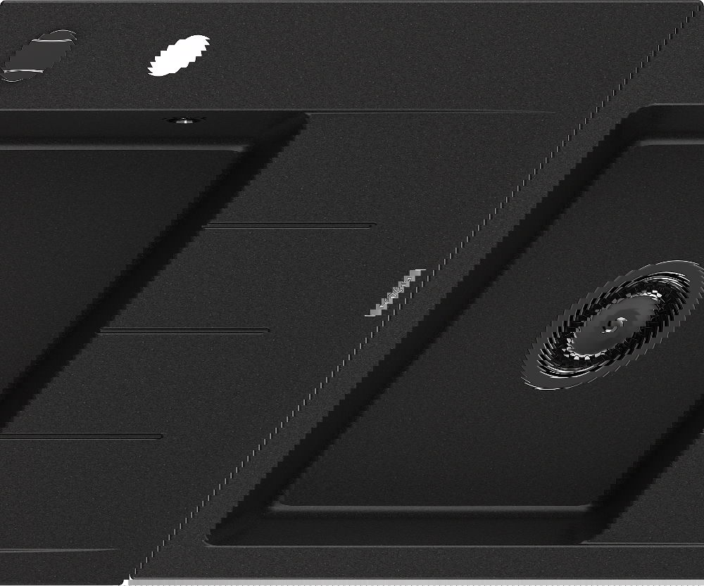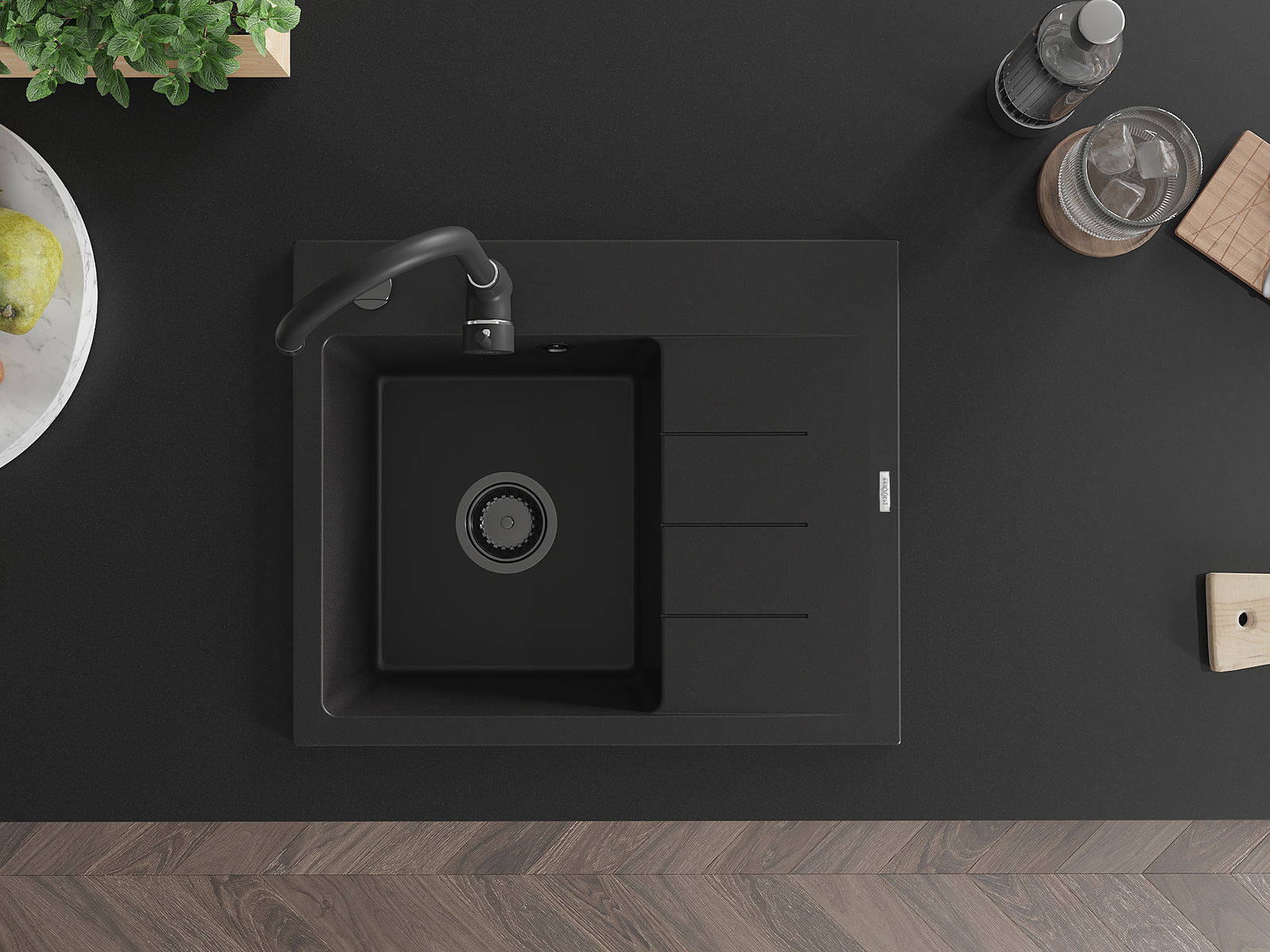 Mexen Ben granitinė vienos kameros plautuvė su nuvarvėjimo kraštu, kairė 600 x 500 mm, juoda, sifonas juodas