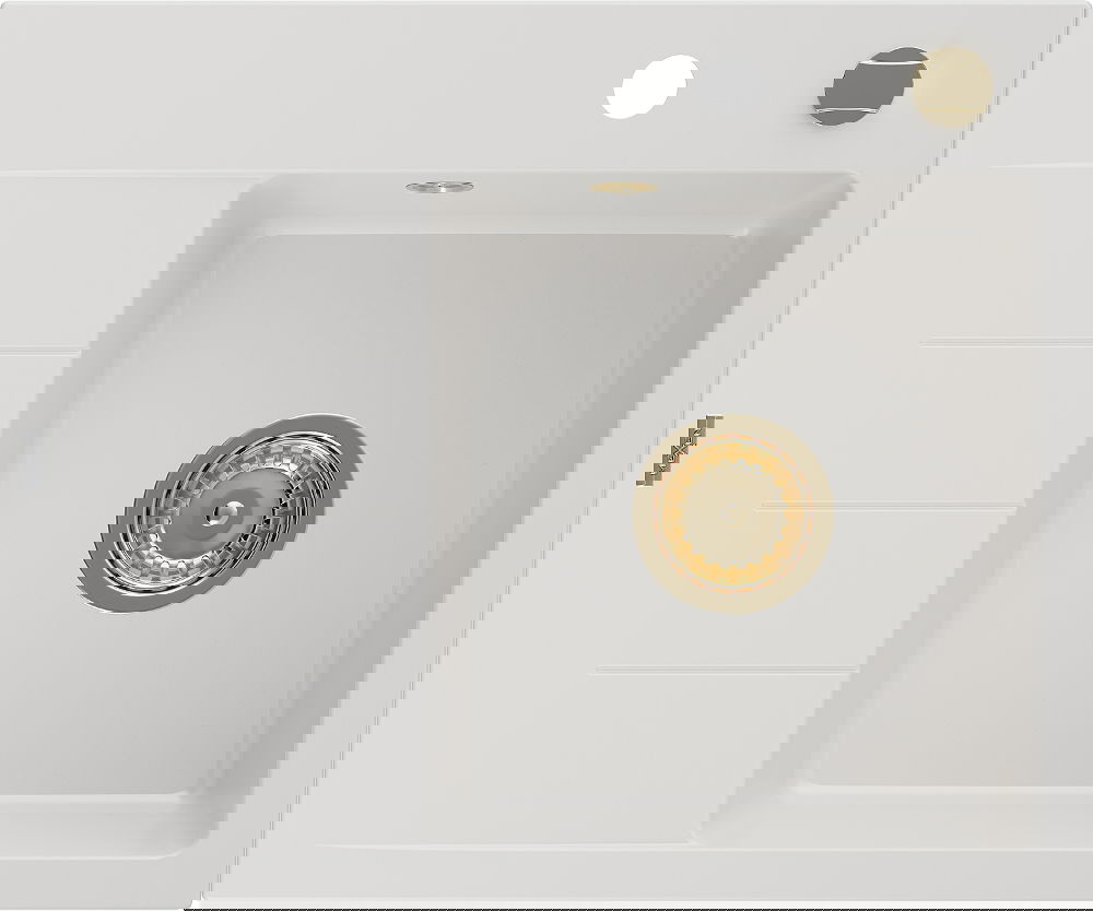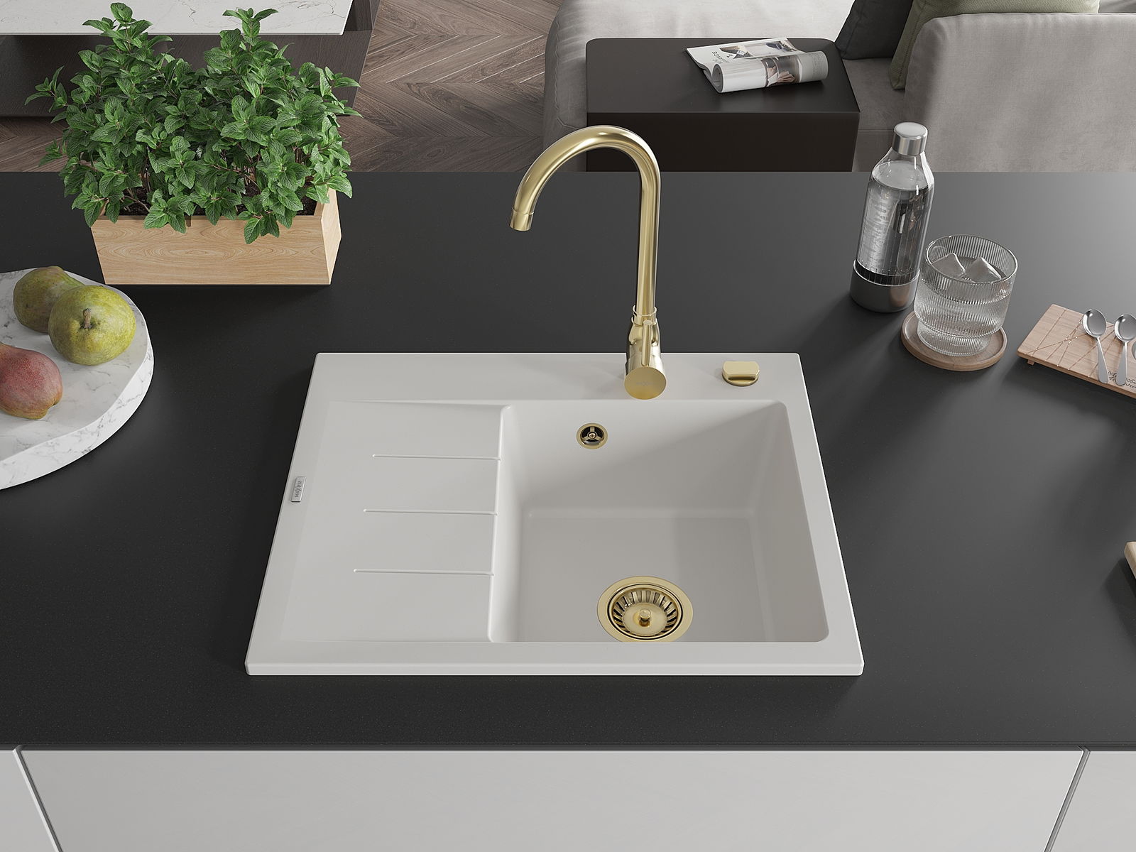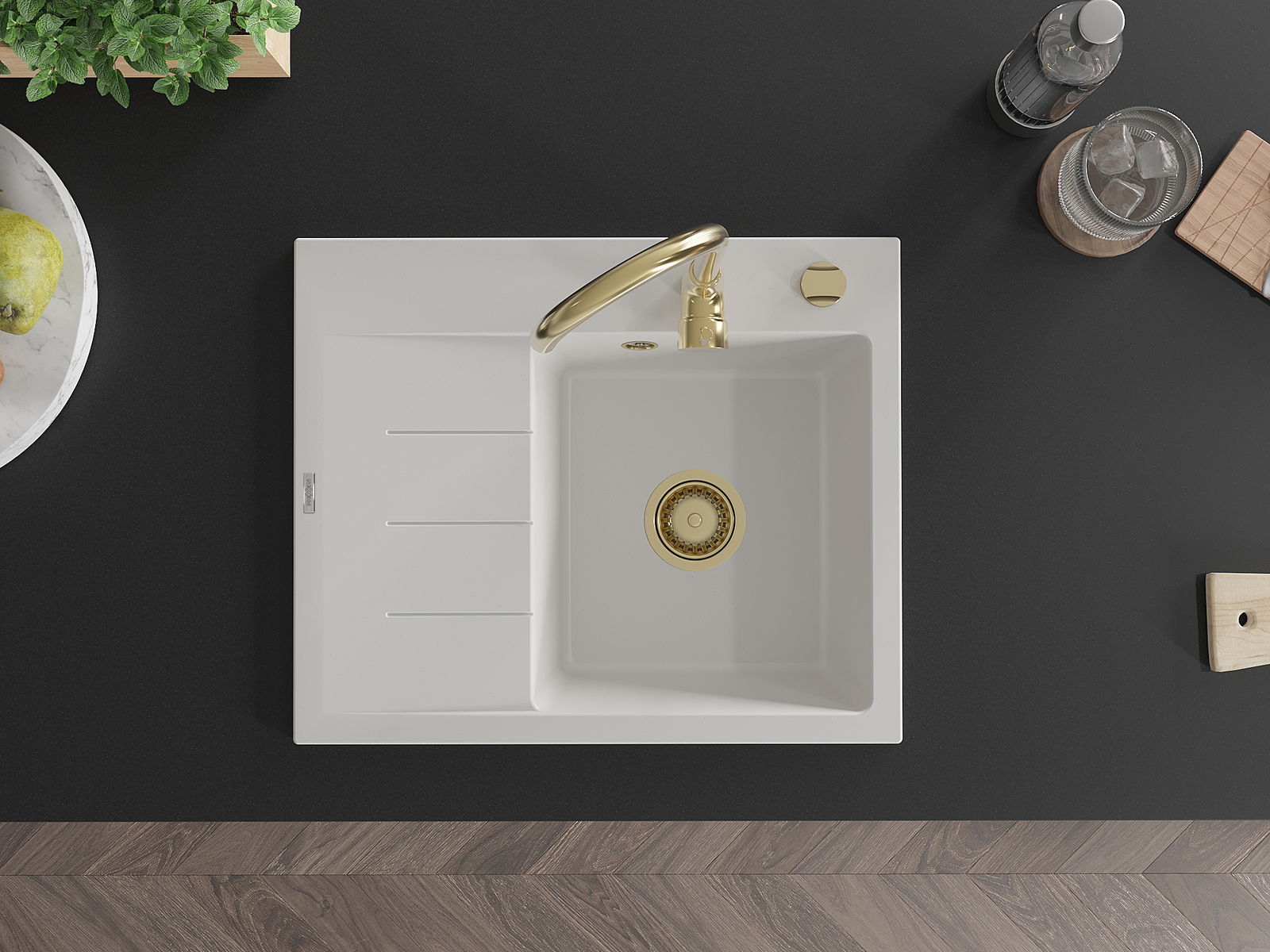 Mexen Ben granitinė plautuvė su 1 skyreliu ir nusausintuvu, dešinė 600 x 500 mm, balta, sifonas auksinis - 6523605000-20-G