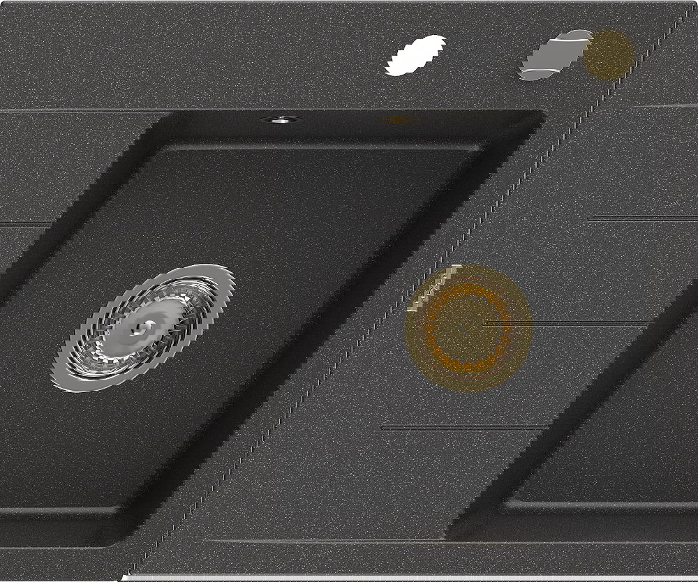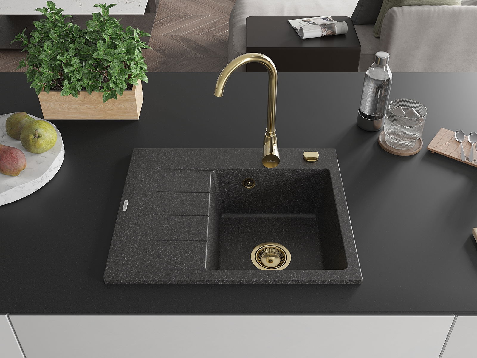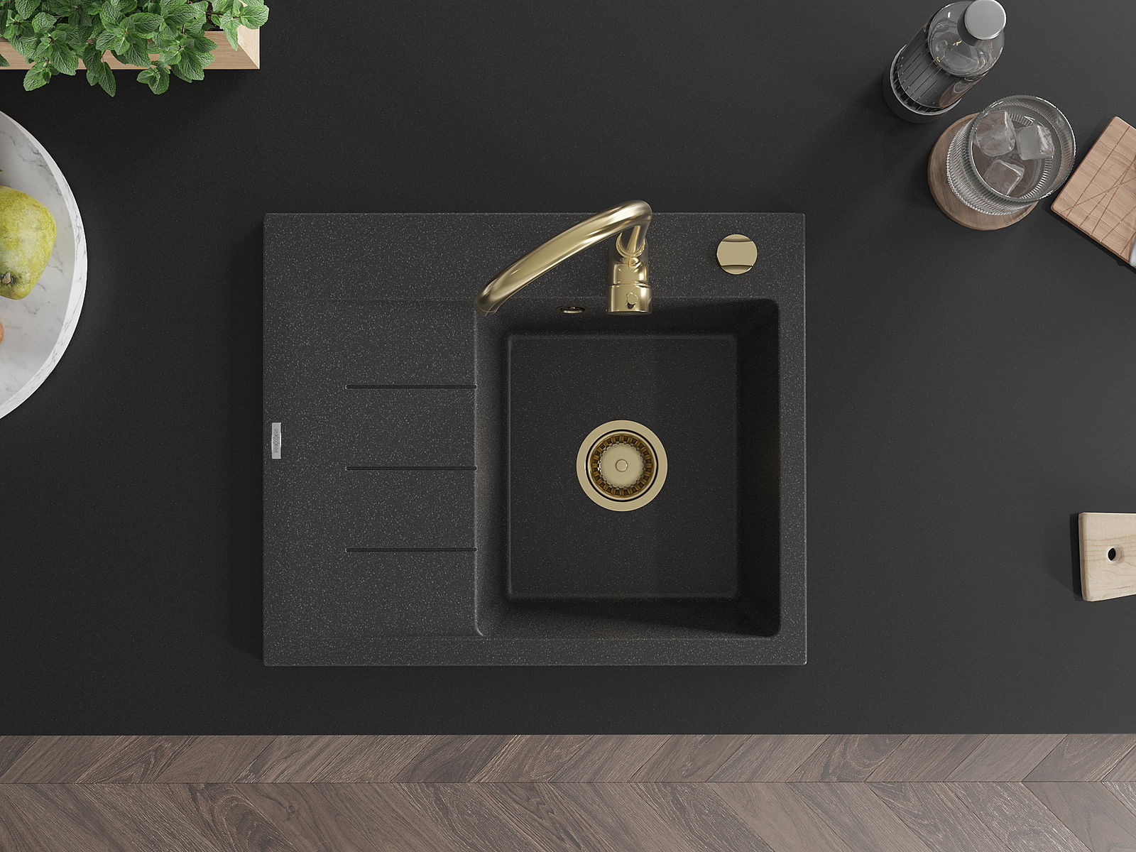 Mexen Ben granitinė vienaaukštė kriauklė su nutekėjimu, dešinė 600 x 500 mm, juoda taškuota, auksinis sifonas