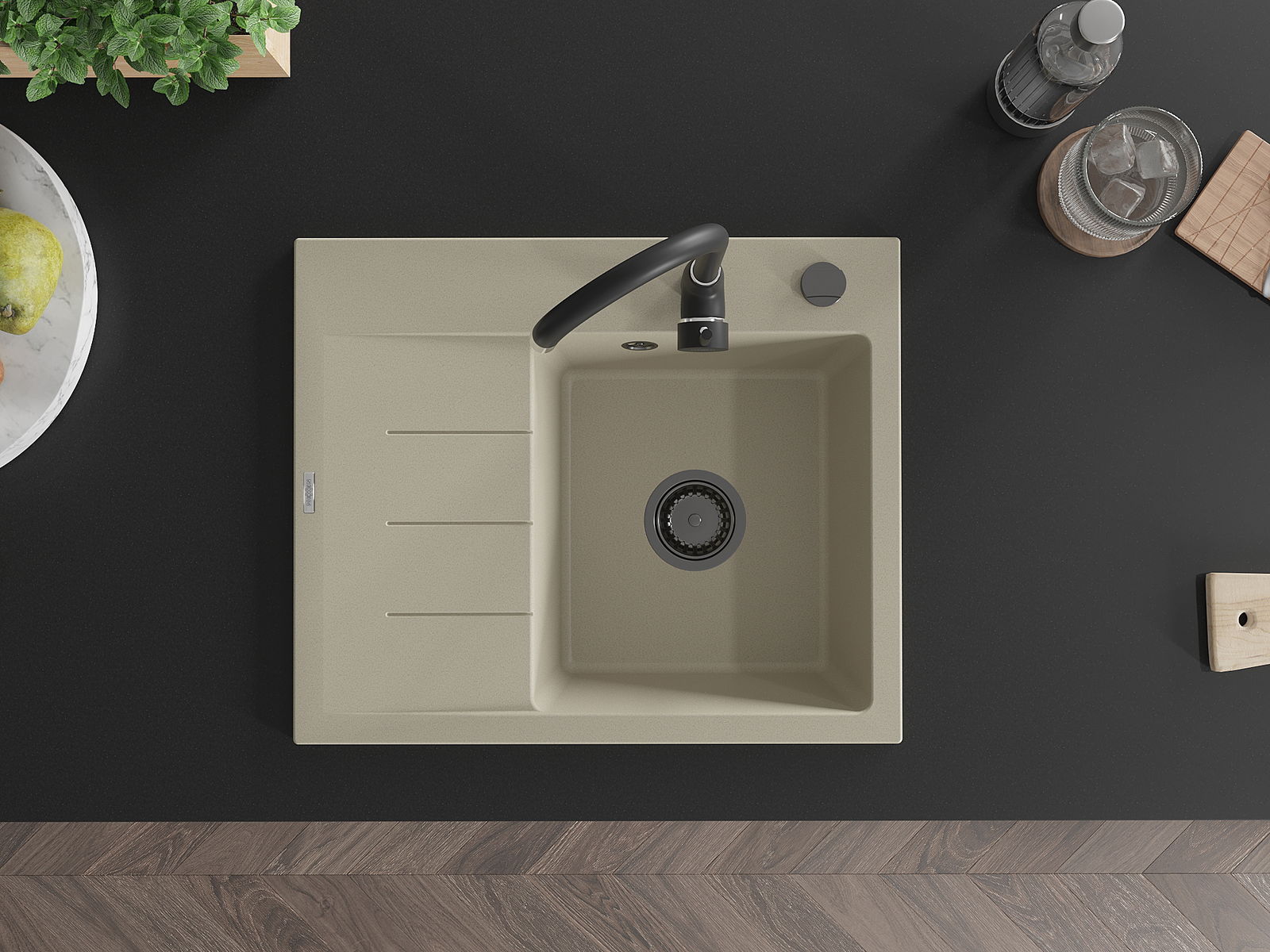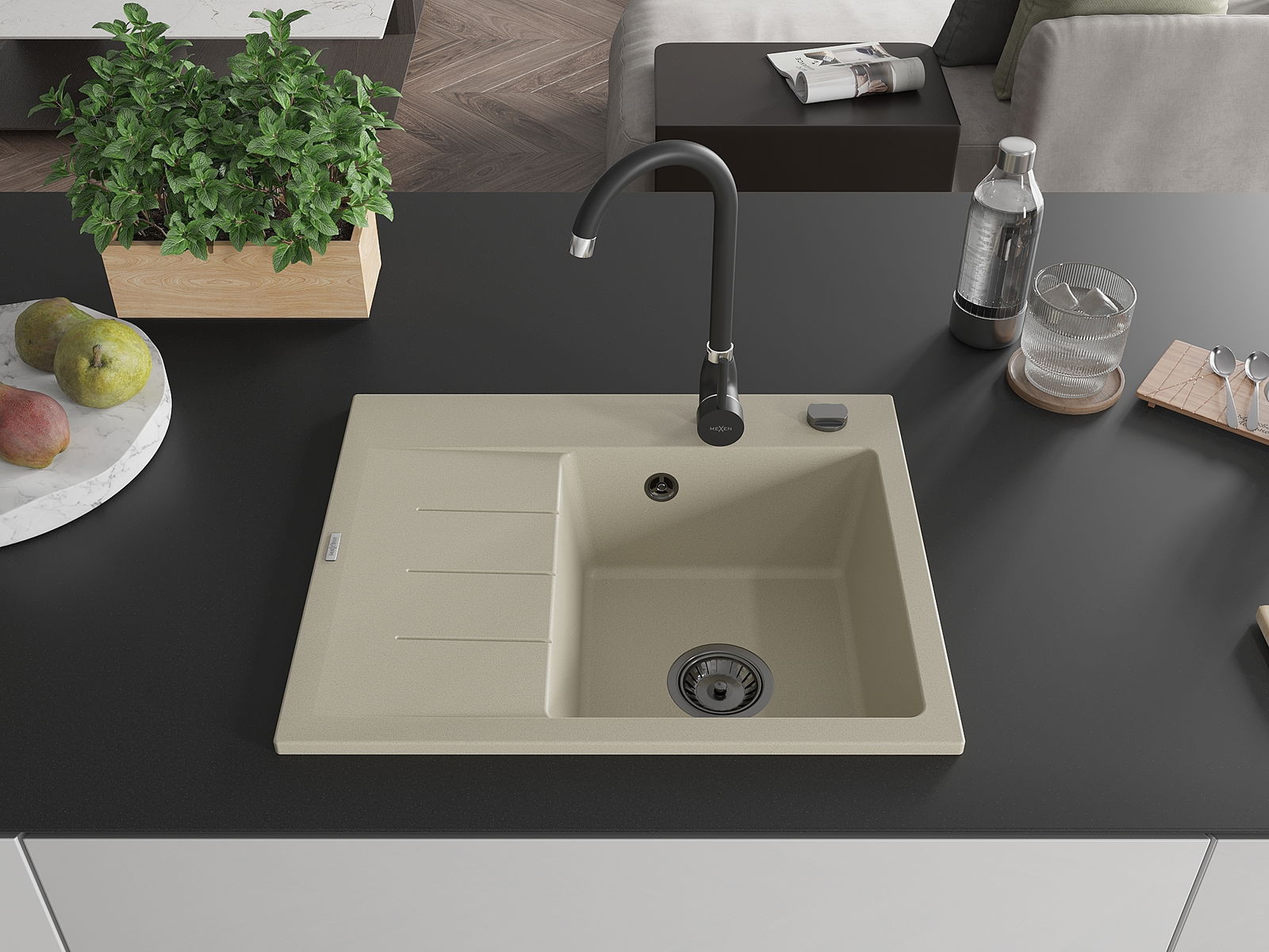 Mexen Ben granitinė virtuvės kriauklė su viena plautuve ir drip tray, dešinė, 600 x 500 mm, smėlio spalvos, juodas sifonas