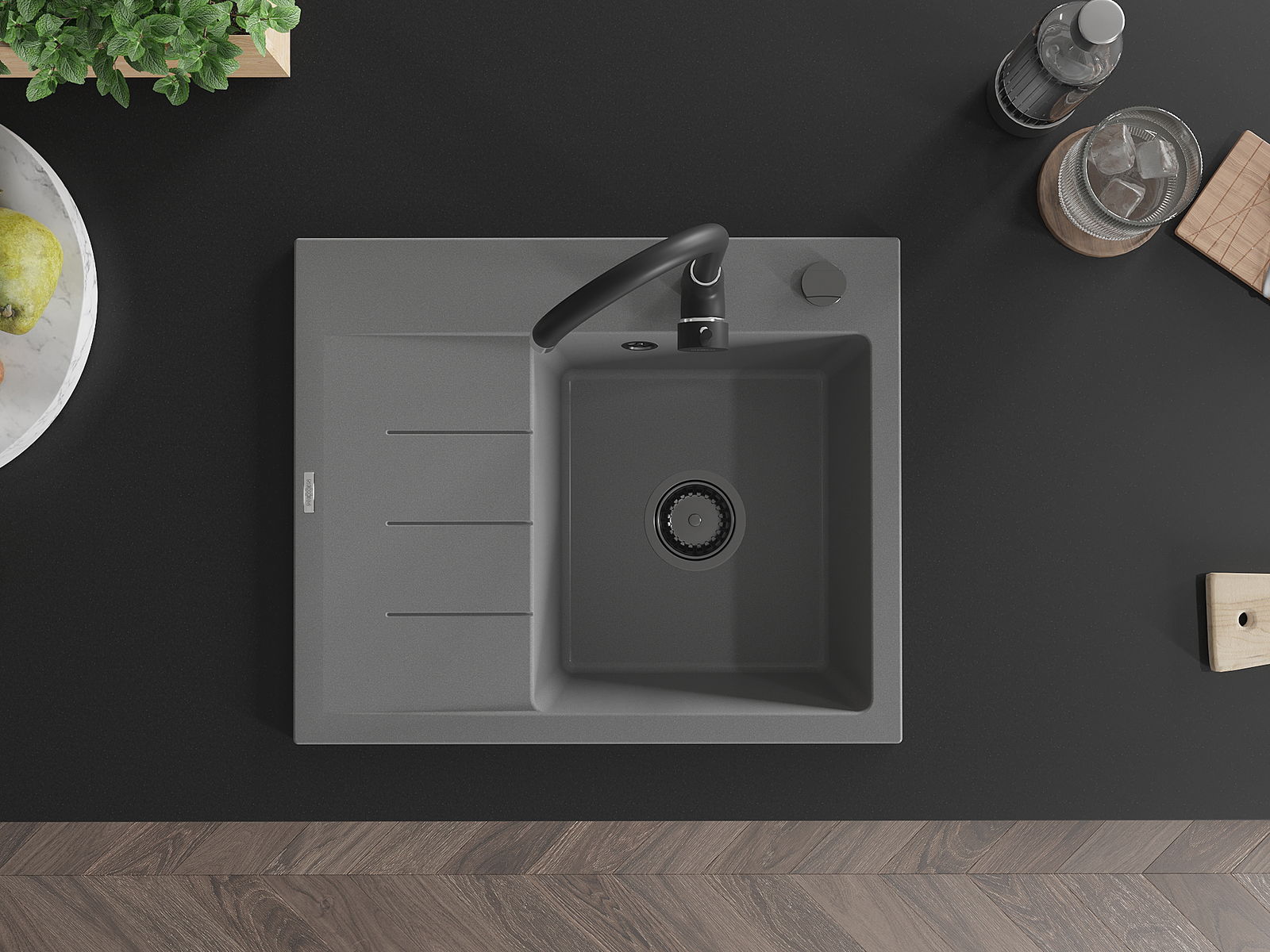 Mexen Ben granitinė vienos plautuvės kriauklė su nusausintuvu, dešinė, 600 x 500 mm, pilka, juodas sifonas