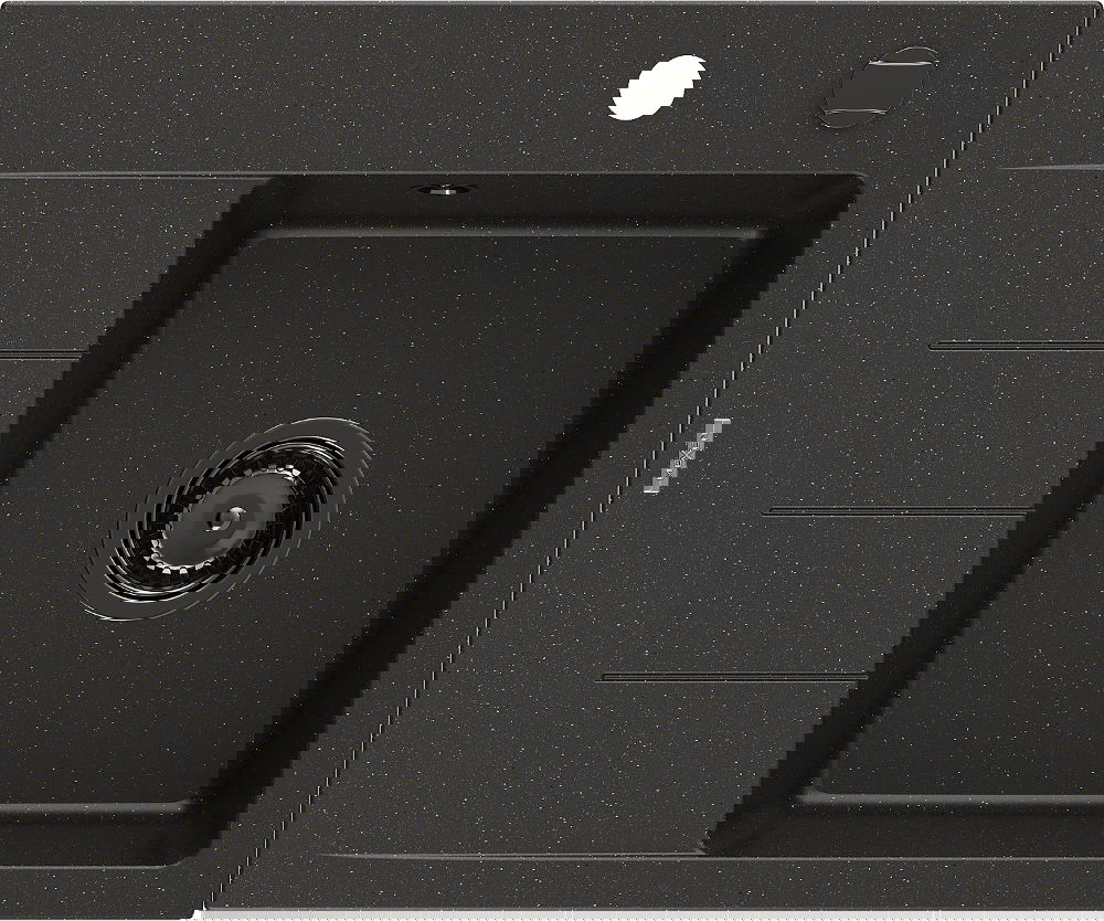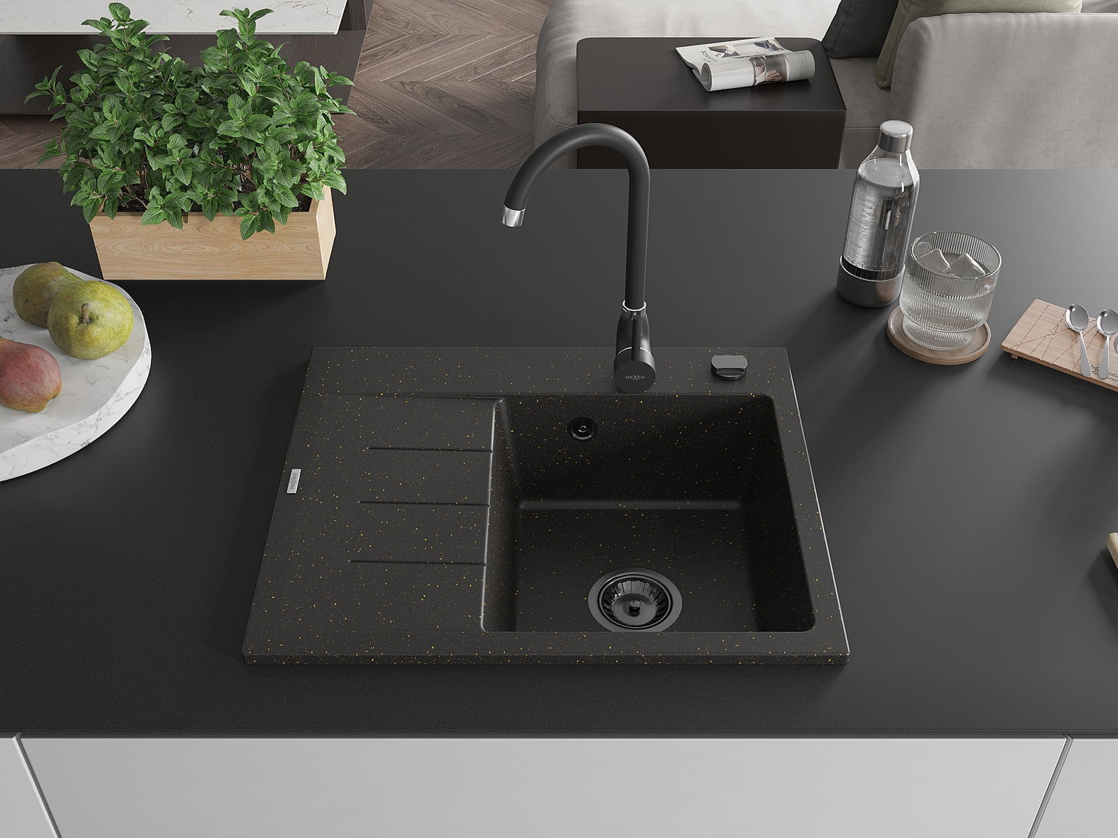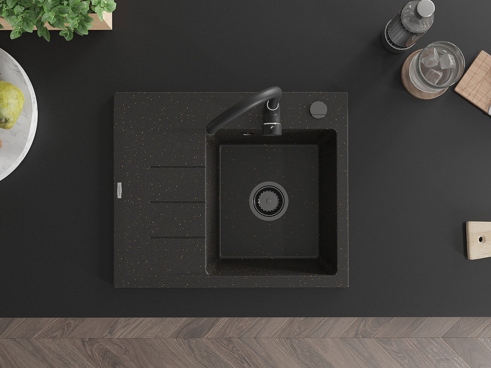 Mexen Ben granitinė vienos plautuvės plautuvė su lašintuvu, dešinė 600 x 500 mm, juoda/auksinė metaliko sifonas juodas