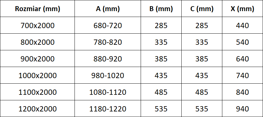 Dušo kabinos, durys ir sienelės yra standartiškai pritaikytos montuoti ant nustatytų matmenų dušo padėklų. Būtent šie matmenys nurodomi gaminio pavadinime arba aprašyme. Tačiau atkreipkite dėmesį, kad faktiniai elementų matmenys gali šiek tiek skirtis nuo vardinių verčių. Planuojant montuoti tiesiai ant grindų, rekomenduojama atidžiai patikrinti išorinius matmenis ir elementų išdėstymą pagal techninį brėžinį.