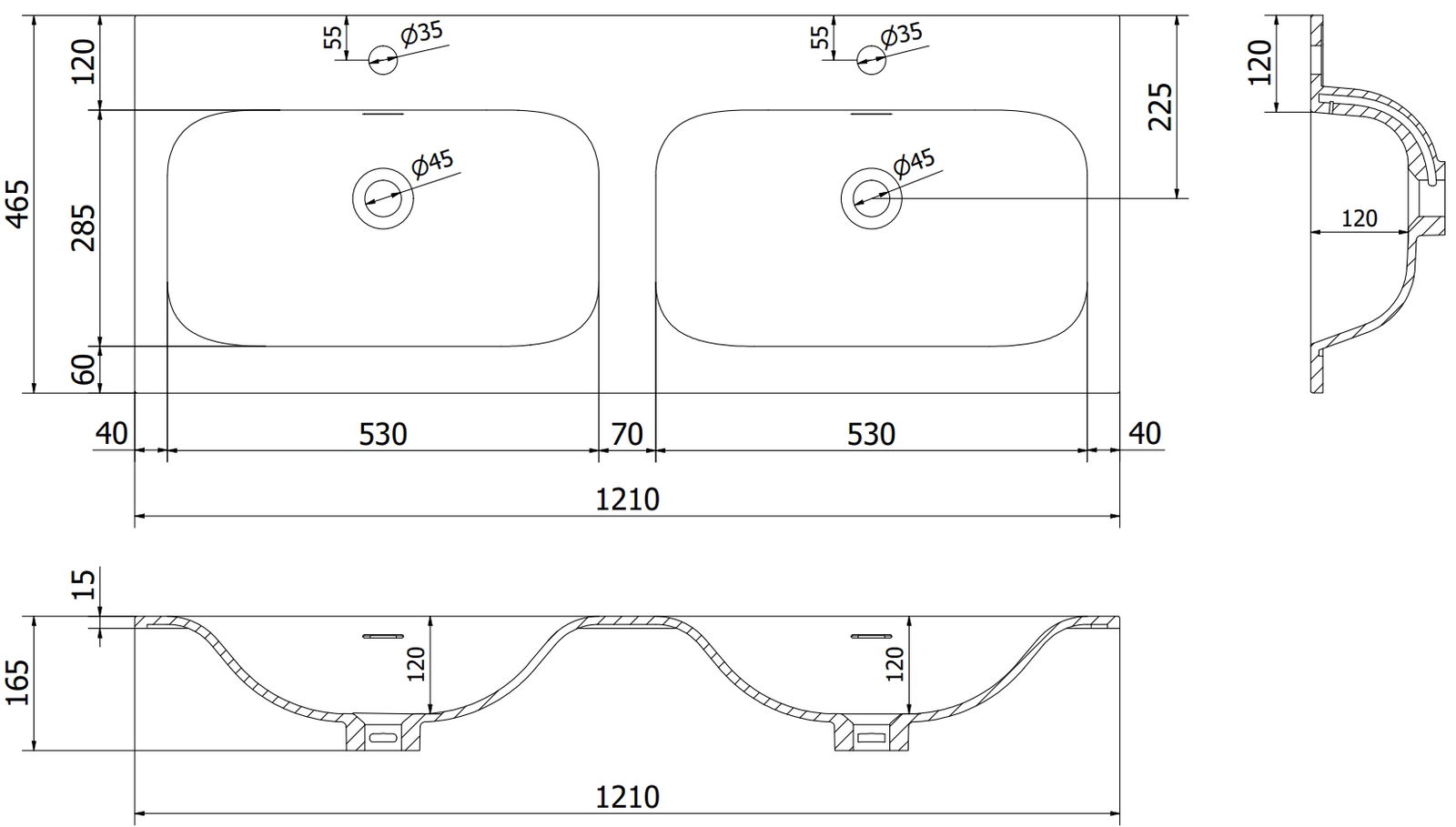 Mexen Vela dvigubas įmontuojamas praustuvas stalviršyje 121 x 46,5 cm, matinis baltas - 25231201D