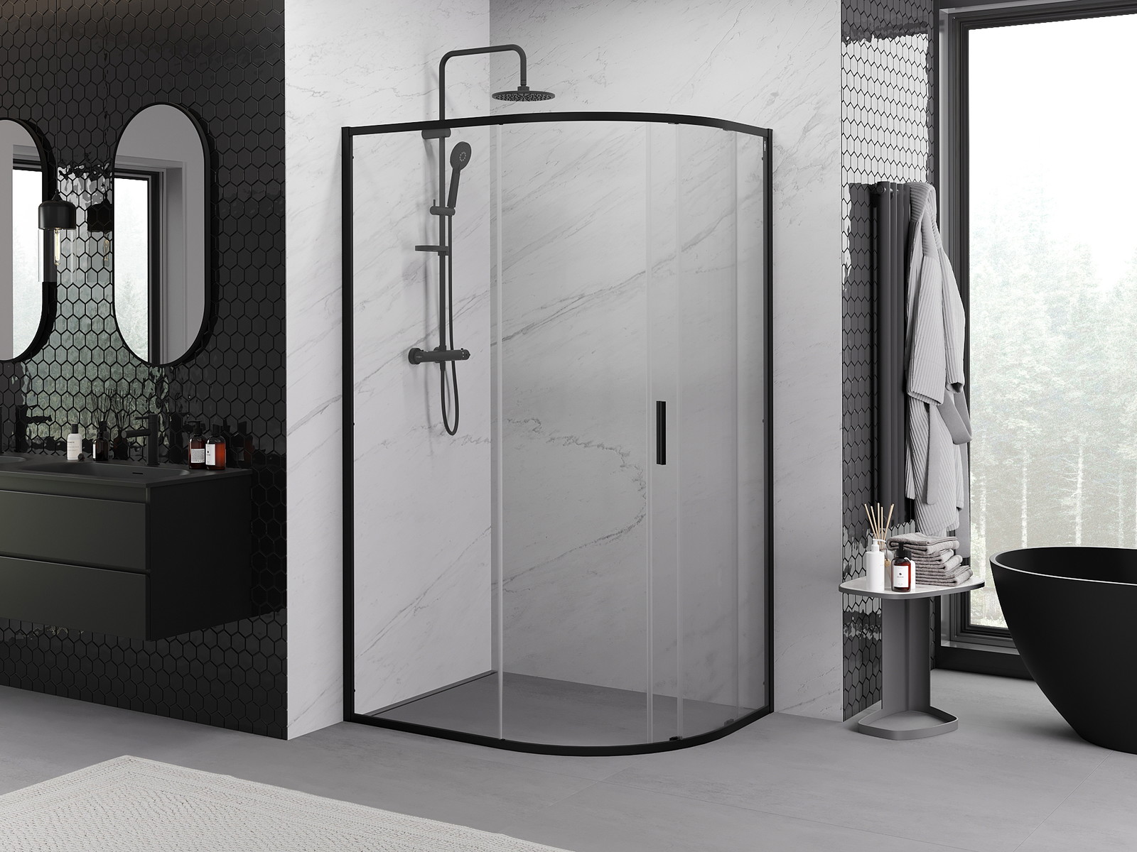 Mexen Exo Asimetrinė pusiau apvali slenkanti dušo kabina 90 x 80 cm, skaidri, juoda - 8131-090-080-70-00