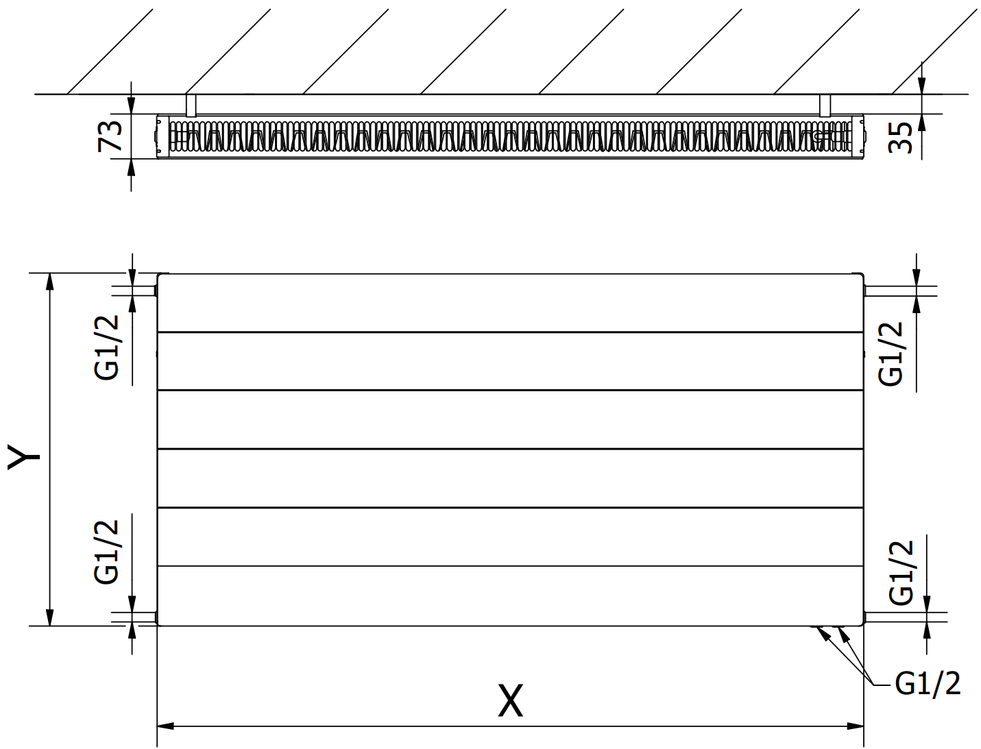 - 2xG ½″ iš apačios dešinėje arba kairėje pusėje