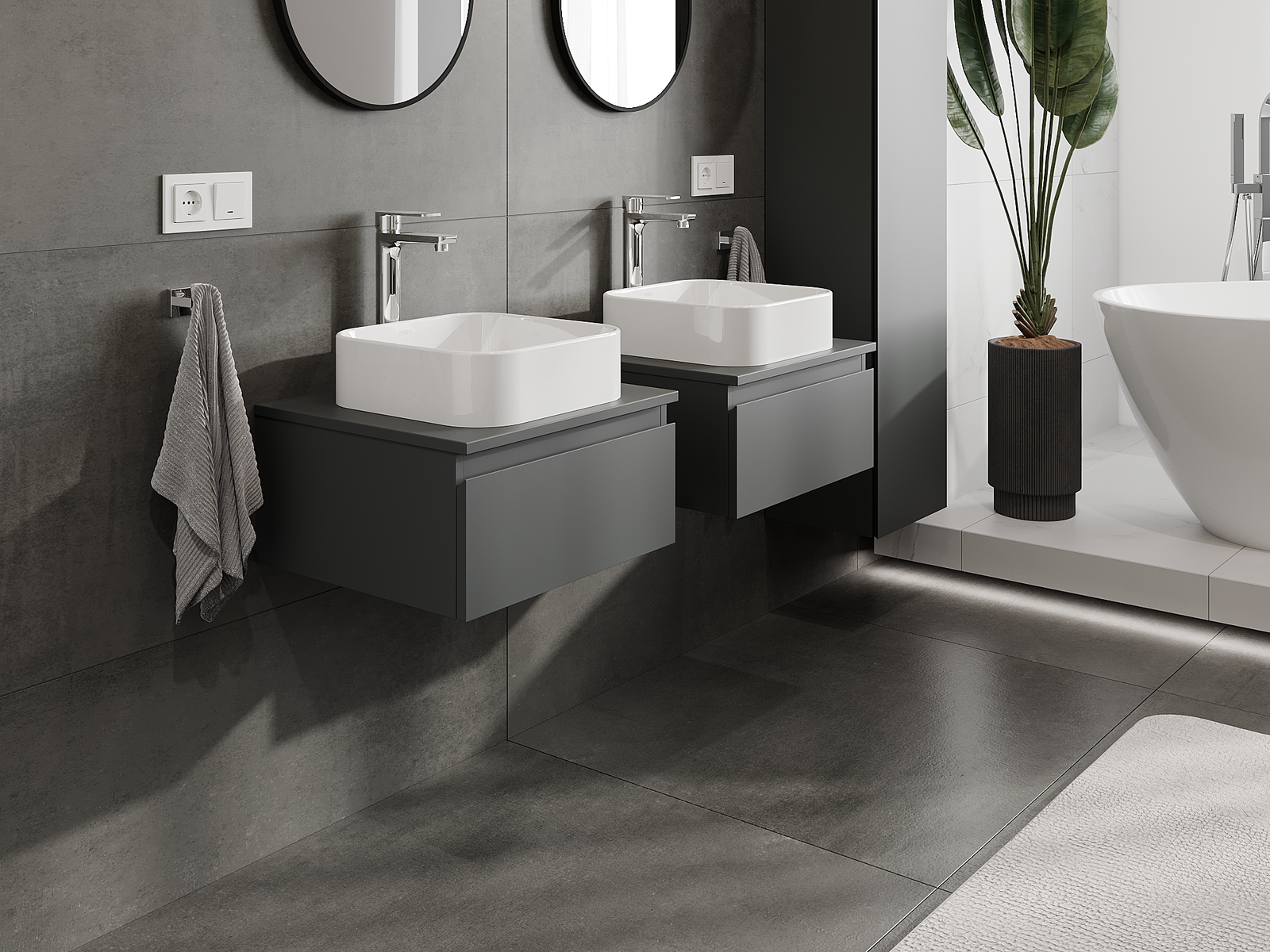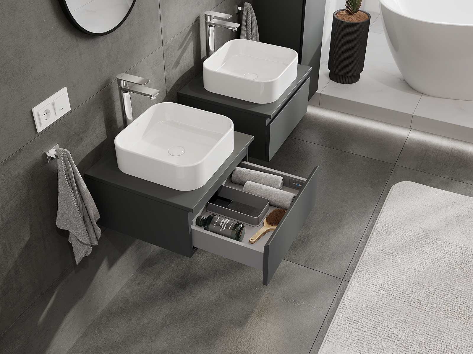 Mūsų moduliniai vonios baldai gali būti derinami tarpusavyje įvairiomis spalvų konfigūracijomis, leidžiant visiškai pritaikyti pagal asmeninius poreikius. Galima pasirinkti tiek atskirų elementų išvaizdą, tiek funkcijas, kas leidžia baldus pritaikyti pagal savo stiliaus ir naudojimo preferencijas.