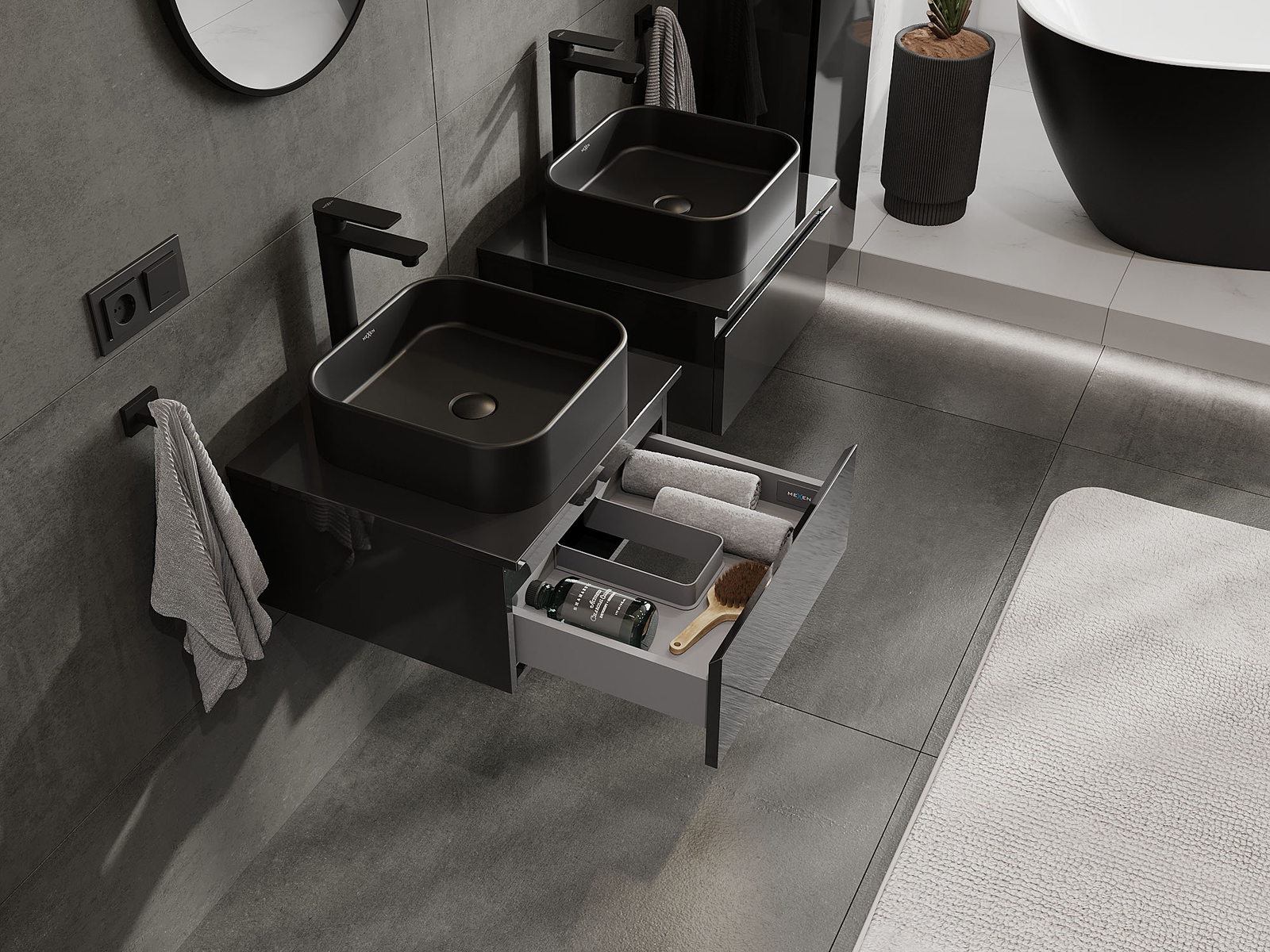 Mexen Orio yra stilinga vonios spintelė po praustuvu, kurios plotis yra 50 cm, derinanti juodo blizgesio eleganciją ir funkcionalumą. Pagaminta iš lakuotos MDF plokštės, pasižymi lygiu priekio paviršiumi. Turi vieną erdvų stalčių su tylaus uždarymo ir pilno ištraukimo funkcija, kas palengvina prieigą prie turinio. Medžiaga, atspari UV spinduliams, garantuoja spalvos ilgaamžiškumą. Idealiai tinka derinti su stalviršiu arba praustuvu Otis, Vela. Produktas jau sumontuotas.