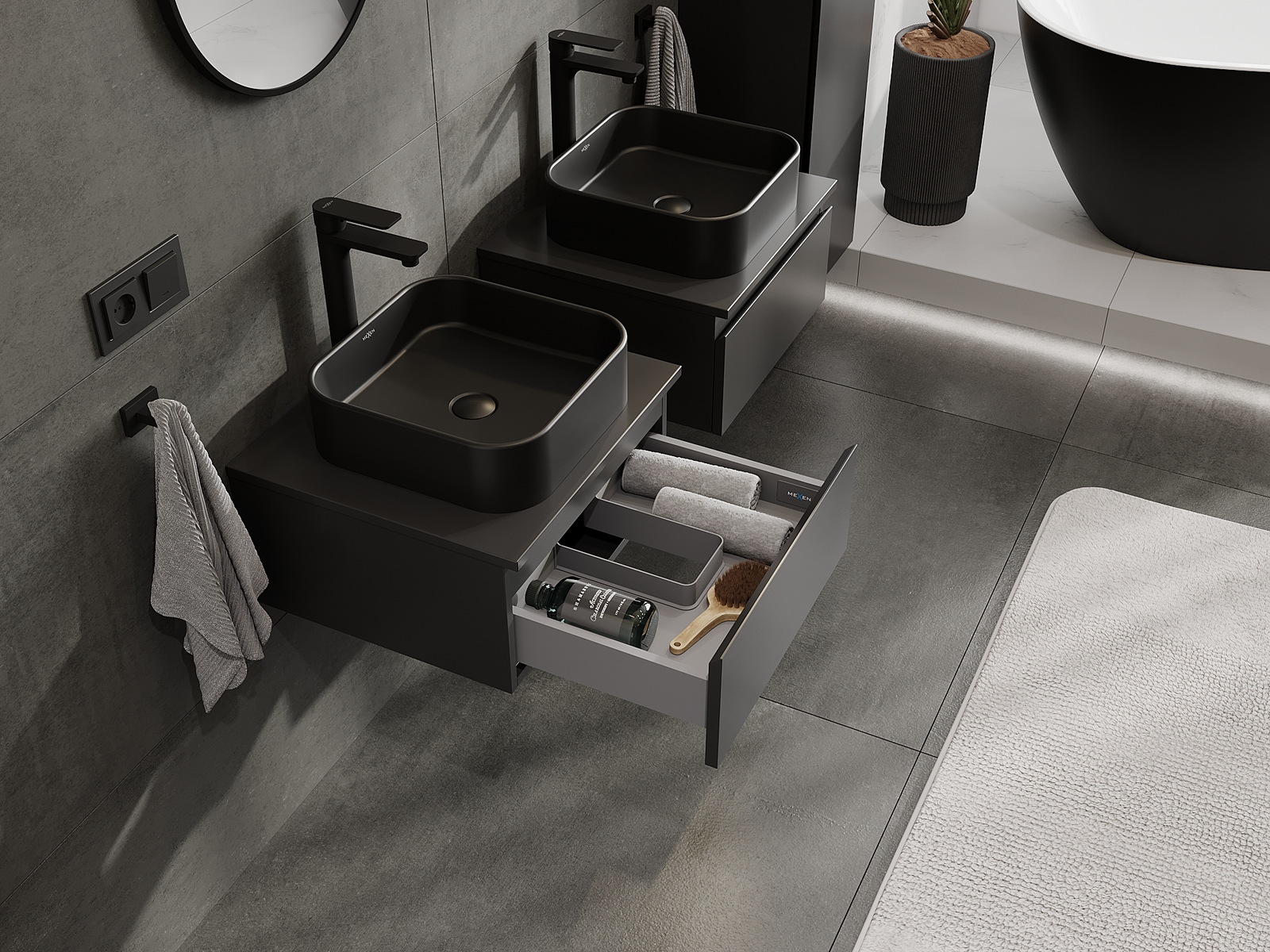 Mūsų moduliniai vonios baldai gali būti derinami tarpusavyje įvairiomis spalvų konfigūracijomis, leidžiant visiškai pritaikyti pagal asmeninius poreikius. Galima pasirinkti tiek atskirų elementų išvaizdą, tiek funkcijas, kas leidžia baldus pritaikyti pagal savo stiliaus ir naudojimo preferencijas.