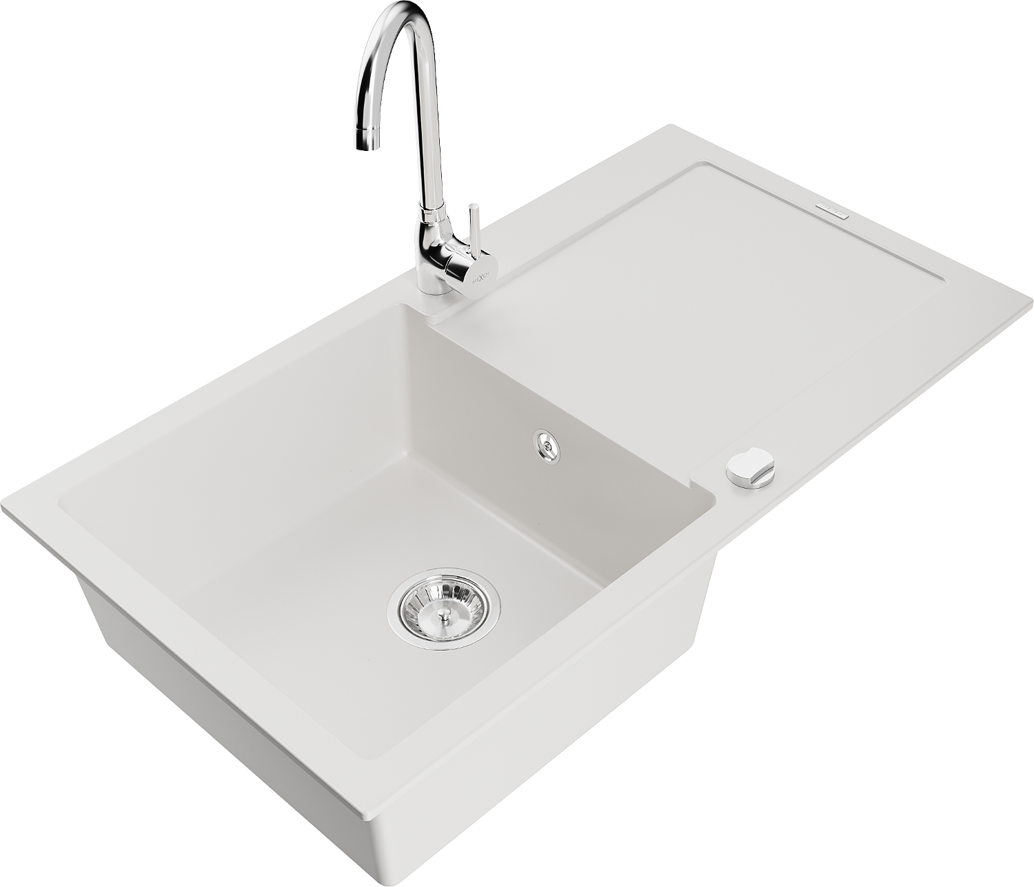 Mexen Leo granitinis vienos kameros kriauklė su nuvarvėjimo paviršiumi ir virtuviniu maišytuvu Telma, balta - 6501-20-670200-00