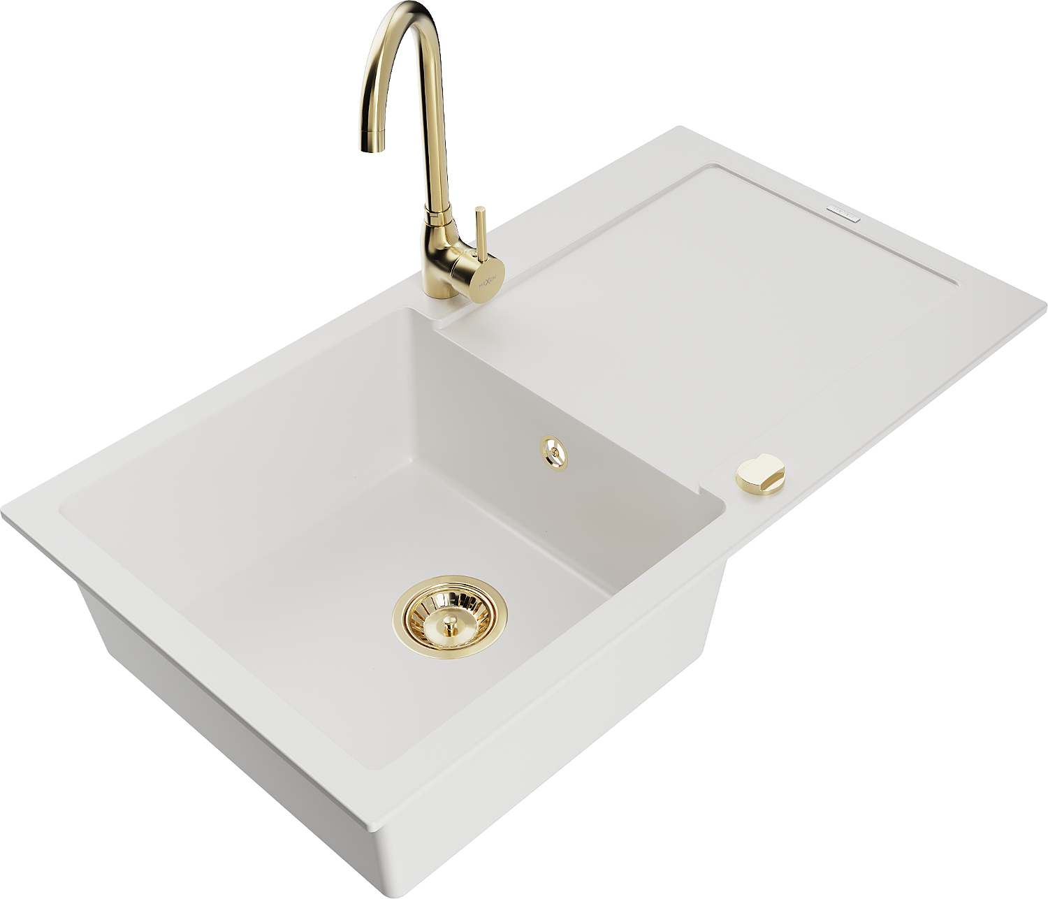 Mexen Leo granitinė plautuvė su viena kamera, džiovykla ir virtuviniu maišytuvu Telma, balta - 6501-20-670200-50