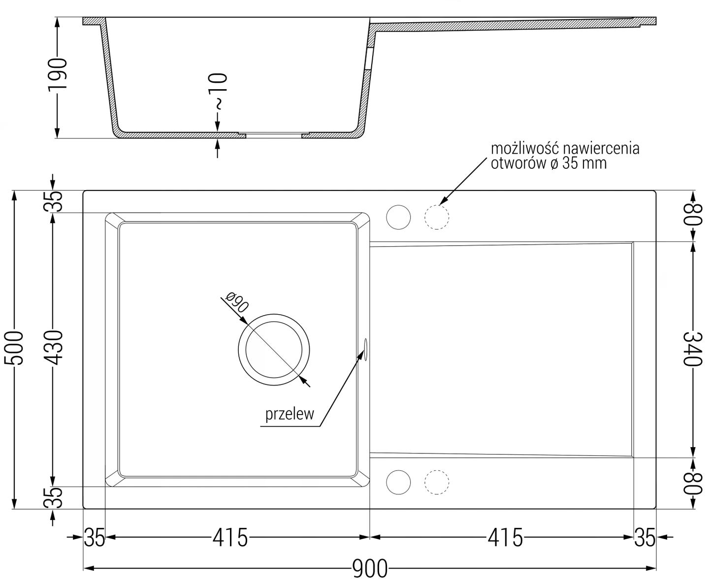Kriauklė turi 2 iš anksto frezuotas skyles, kurių skersmuo yra 35 mm, skirtas savarankiškam išmušimui. Jas galima naudoti, pavyzdžiui, skysčio dozatoriaus montavimui, kuris pašalins plastikinių butelių buvimą virtuvėje ir suteiks jai elegantišką apdailą.