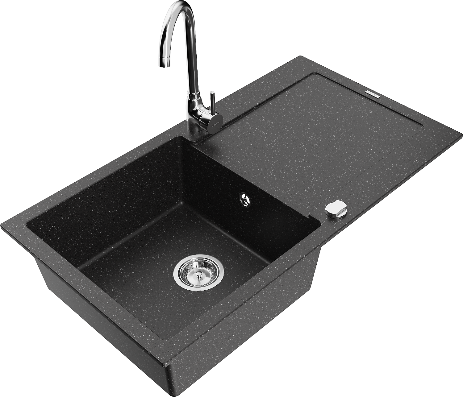 Mexen Leo granitinė vienos kameros plautuvė su džiovintuvu ir virtuviniu čiaupu Telma, juoda/sidabro metalikas
