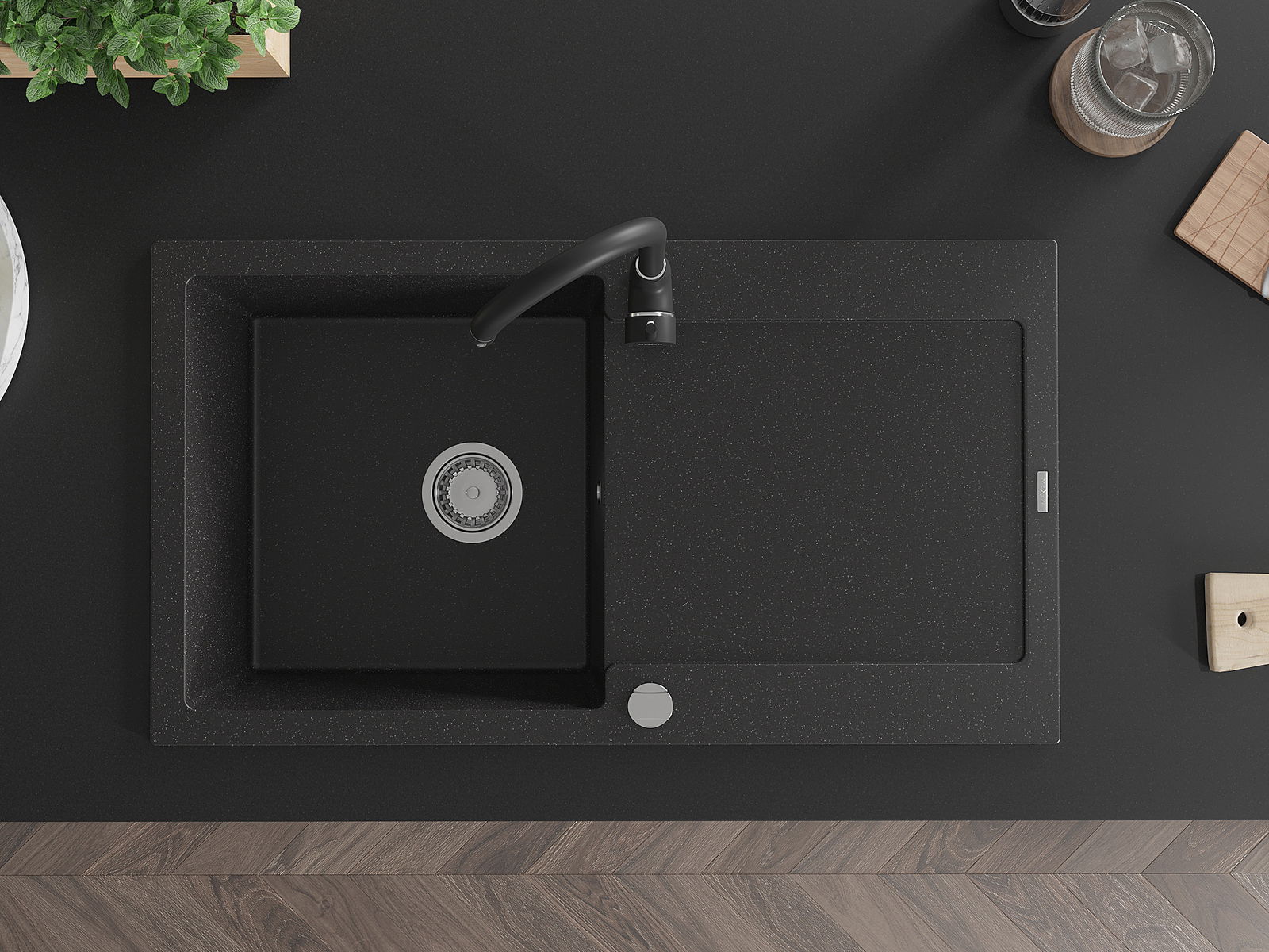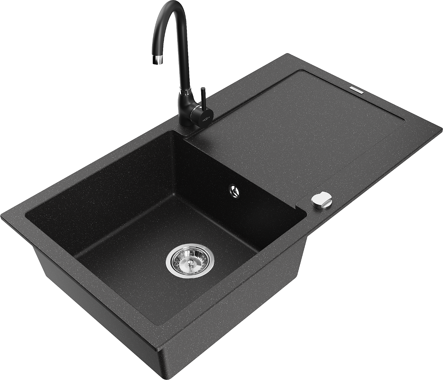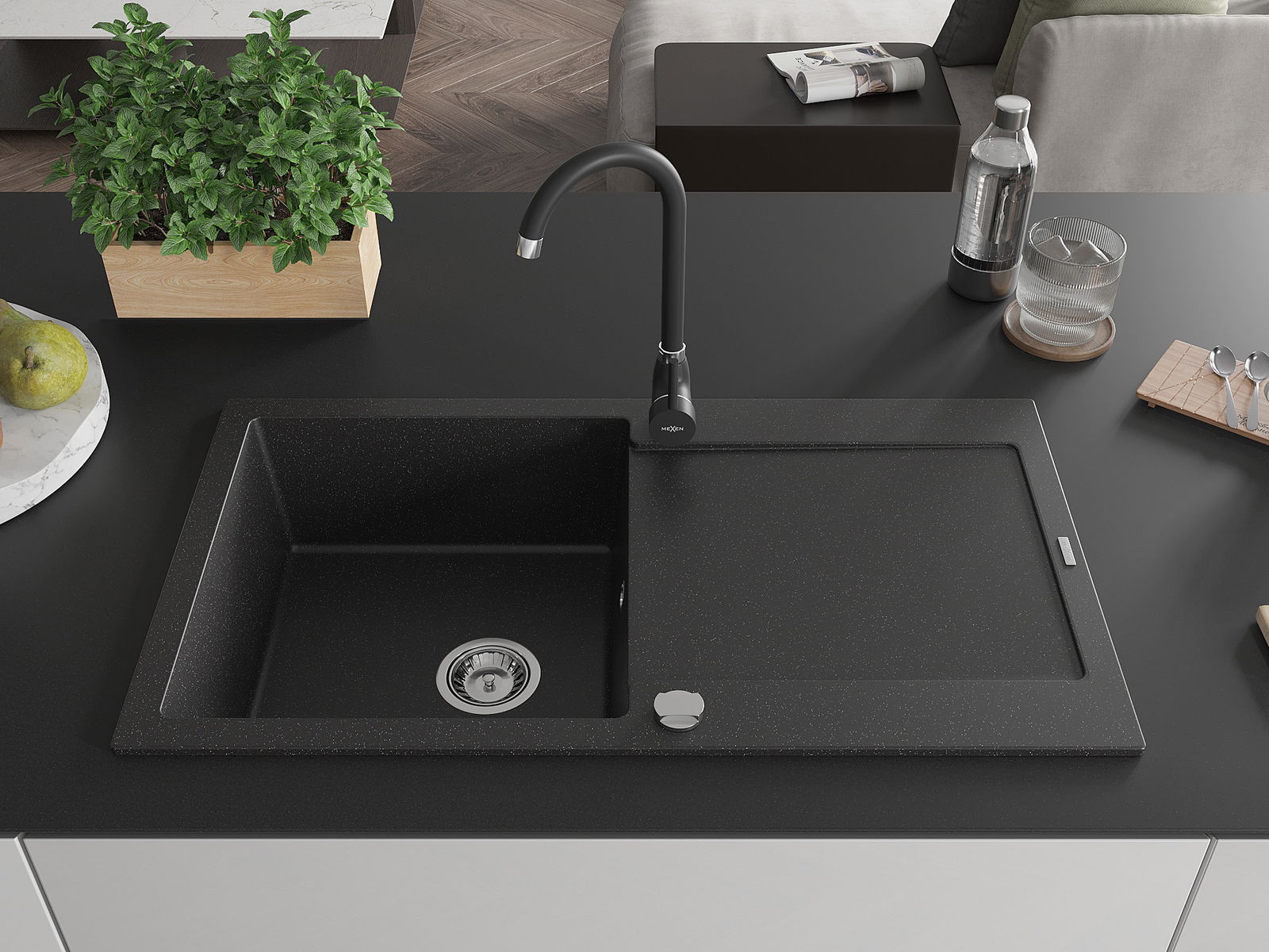 Mexen Leo granitinė vienos kameros kriauklė su nusausintuvu ir virtuviniu maišytuvu Telma, juoda/sidabrinė metalik