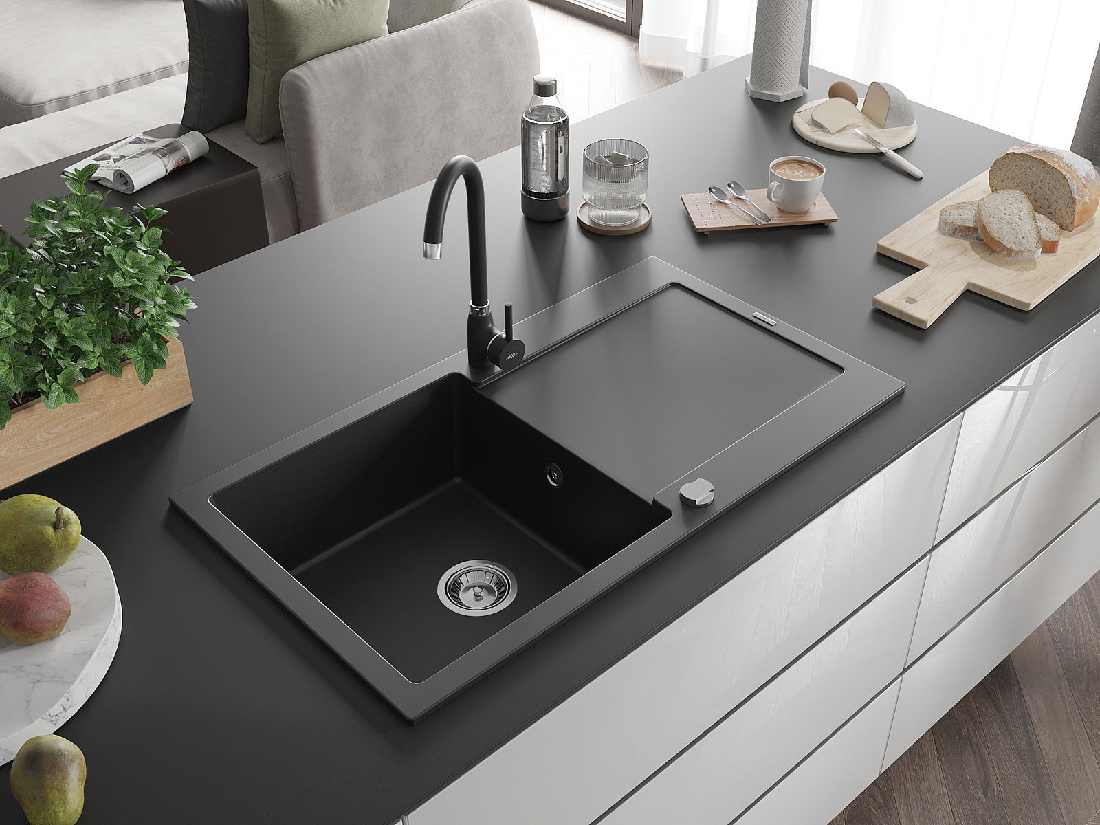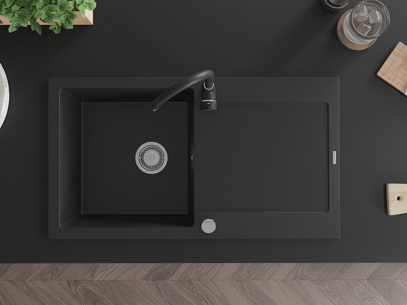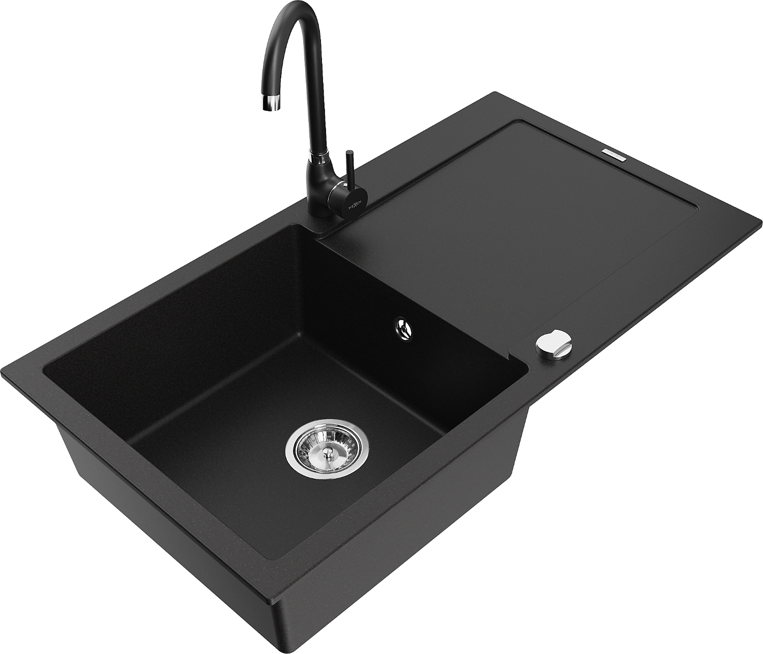 Mexen Leo vieno indo granitinė kriauklė su drenažu ir virtuvės maišytuvu Telma, juoda - 6501-77-670200-70
