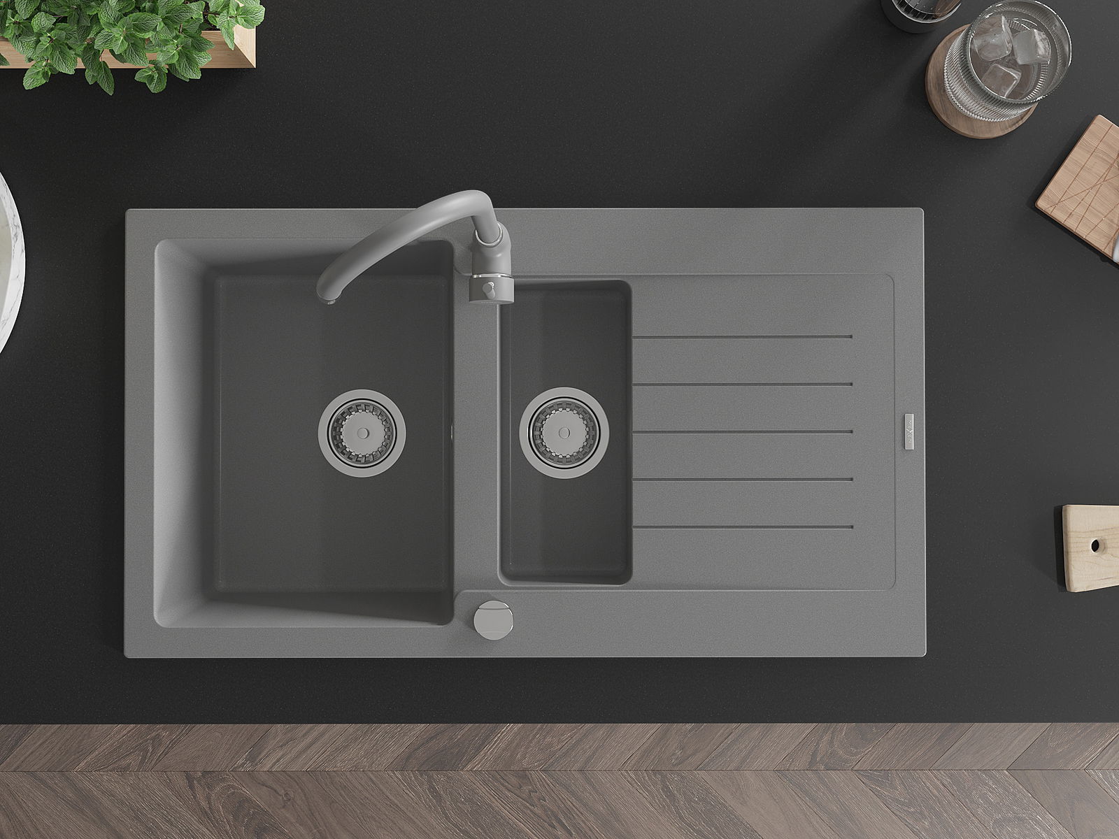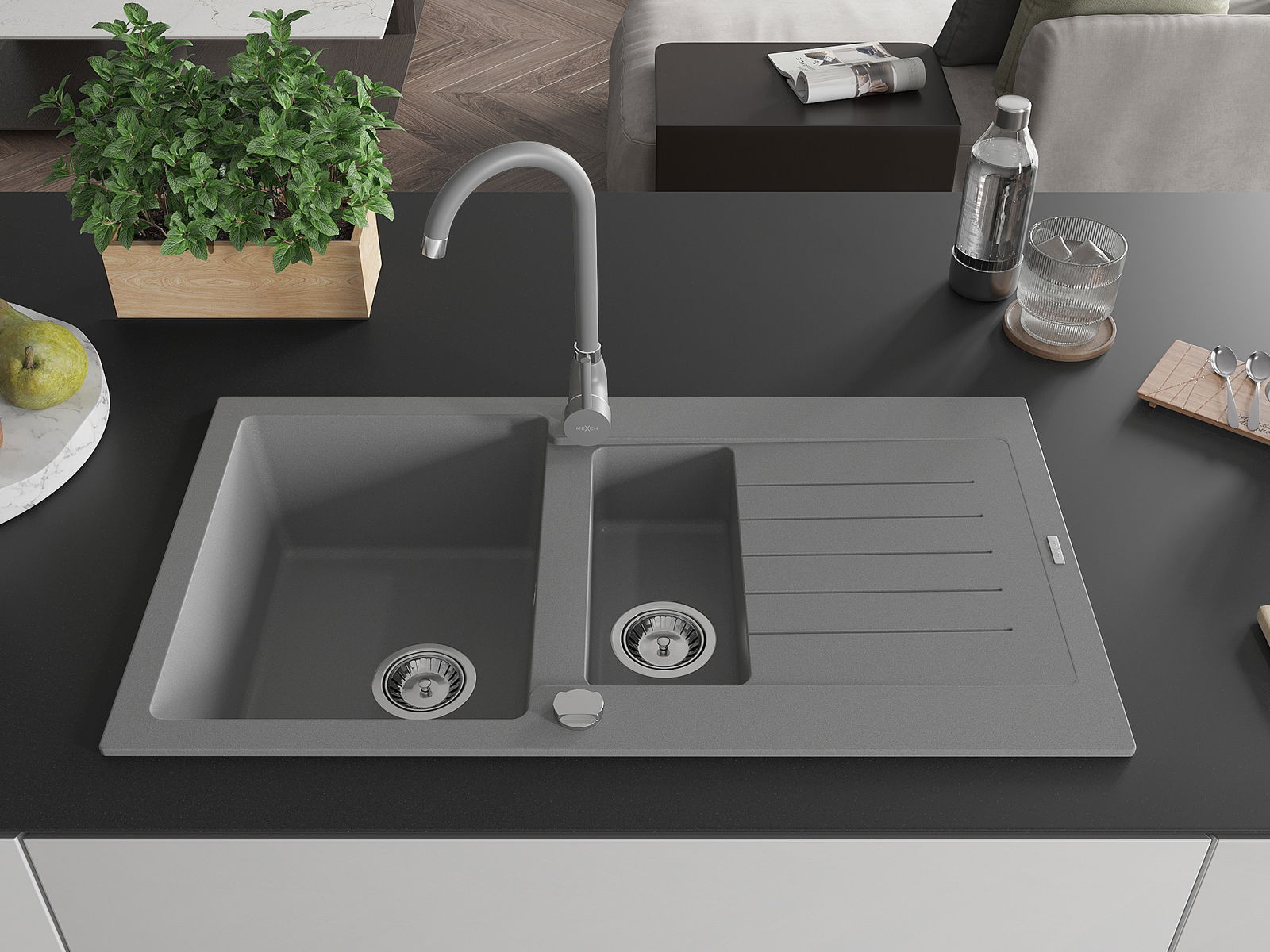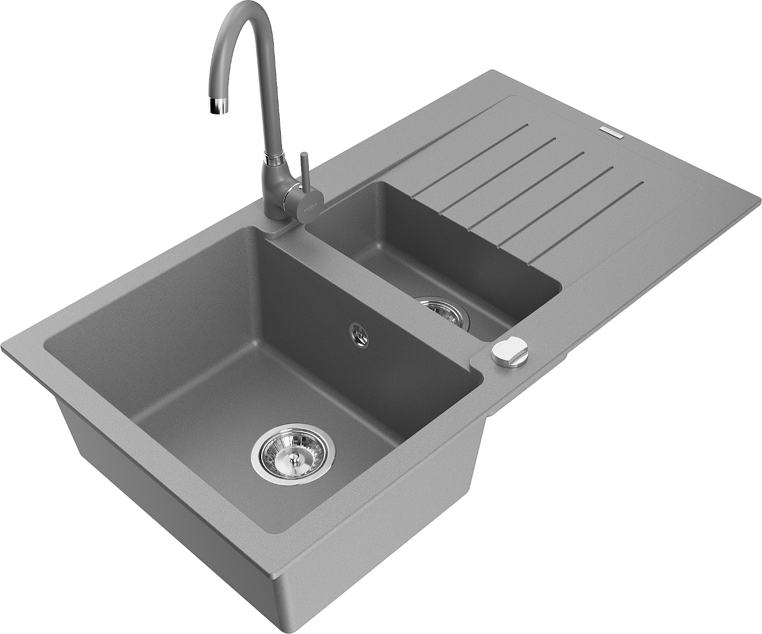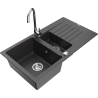 Mexen Matias granitinė 1,5 kamerų kriauklė su nusausinimo paviršiumi ir virtuvės maišytuvu Telma, pilka - 6502-71-670200-71