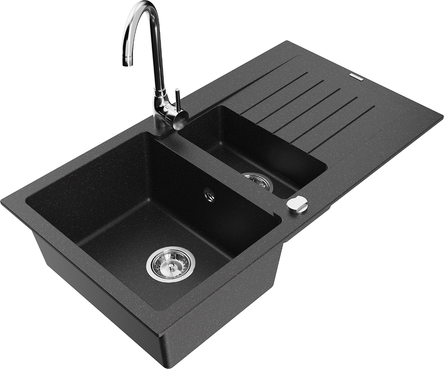 Mexen Matias 1,5 kambario granito plautuvė su nusausinimo vieta ir virtuves maišytuvu Telma, juoda/sidabrinė