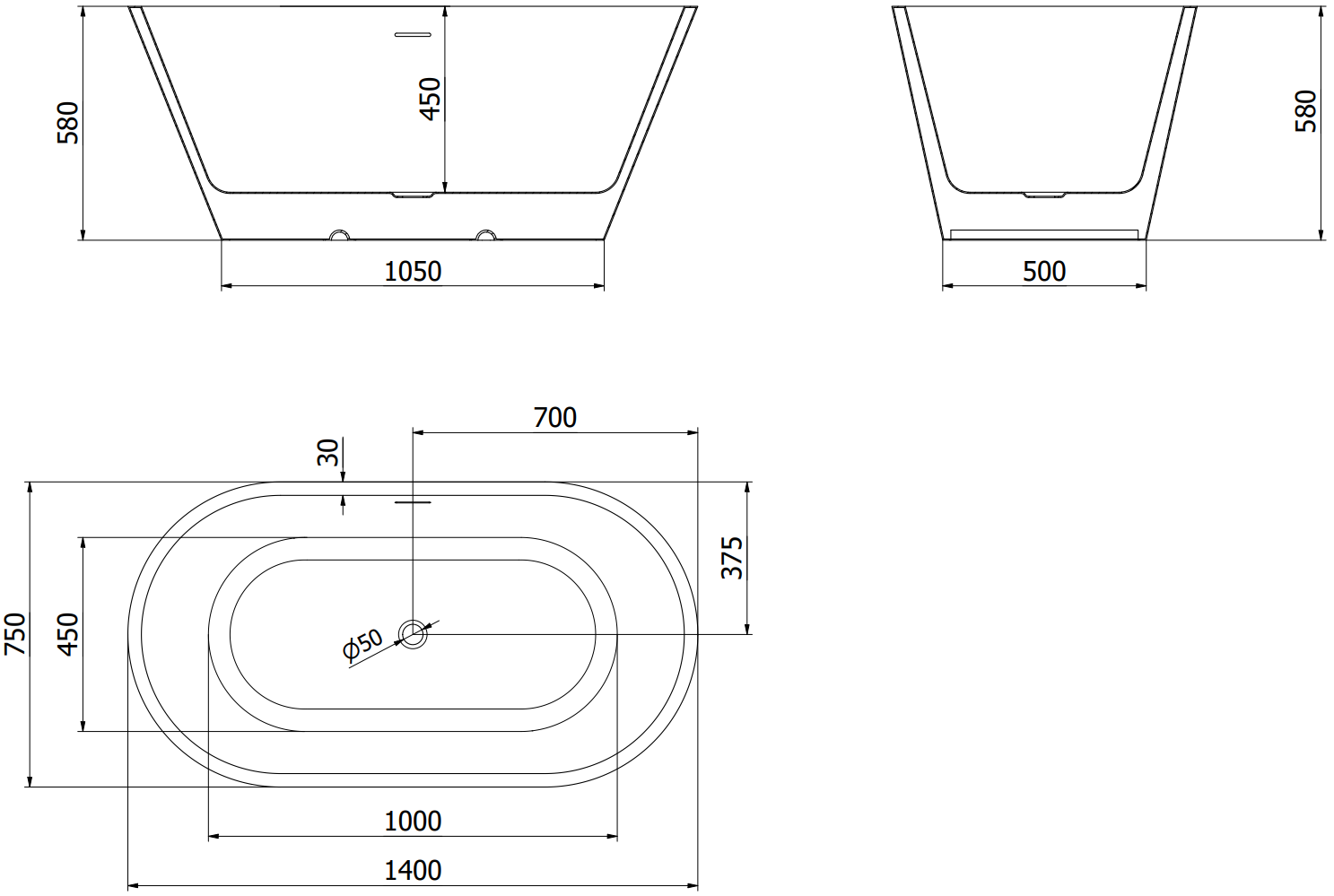 Mexen Luna laisvai pastatoma vonia 140 x 75 cm, balta/juoda, chromuotas perpildymo anga - 52031407575-01