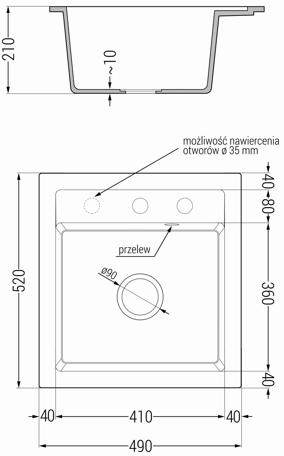 Kriauklė turi išfrezuotą angą, kurios skersmuo 35 mm, kad būtų galima savarankiškai išmušti. Ją galima panaudoti, pvz., montuojant skysto muilo dozatorių, kuris pašalins plastikinių butelių buvimą virtuvėje ir suteiks jai elegantišką apdailą.
