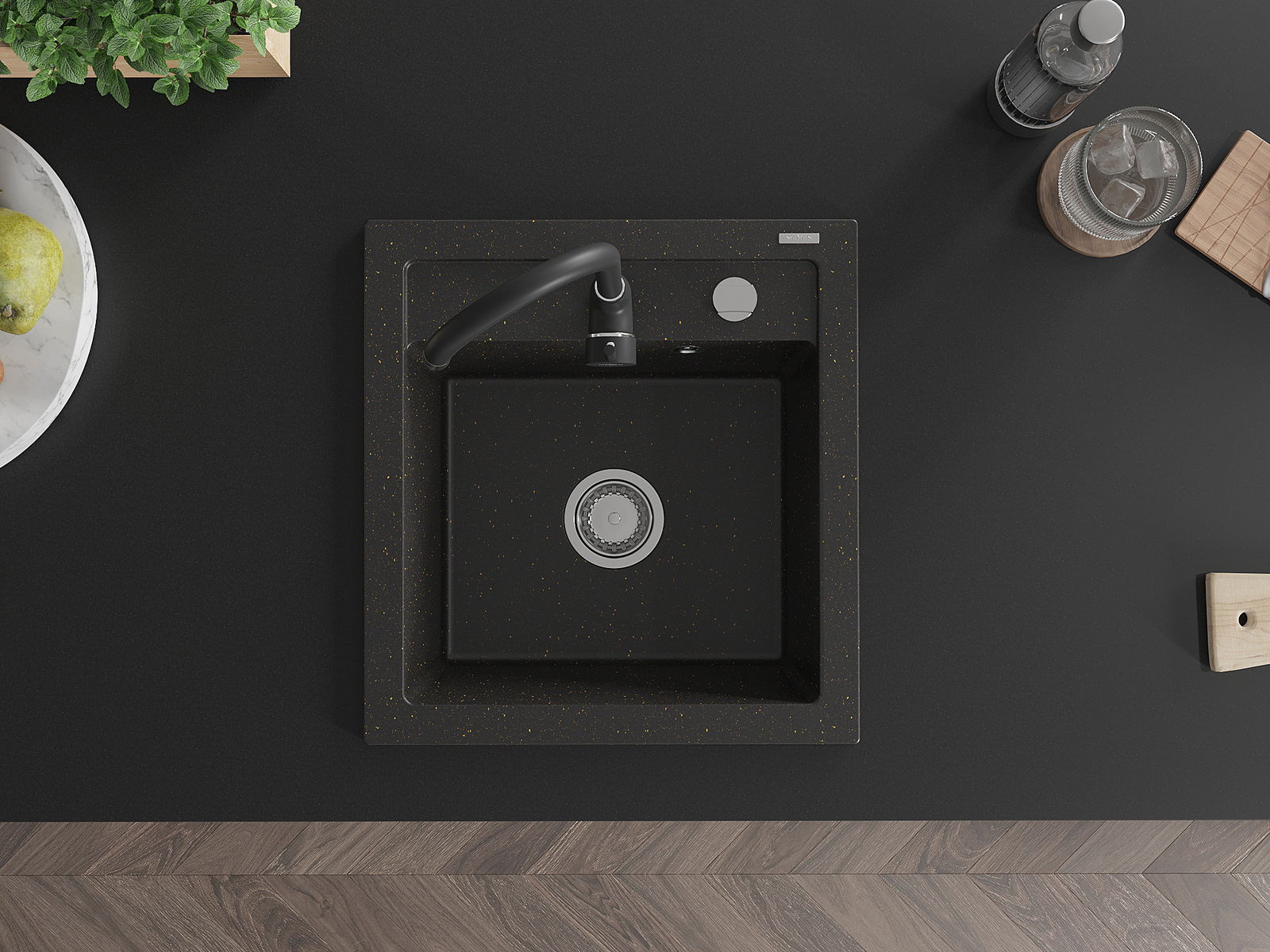 Mexen Vito granitinė vienos kameros plautuvė su virtuviniu maišytuvu Telma, juoda/auksinis metalikas - 6503-75-670200-70