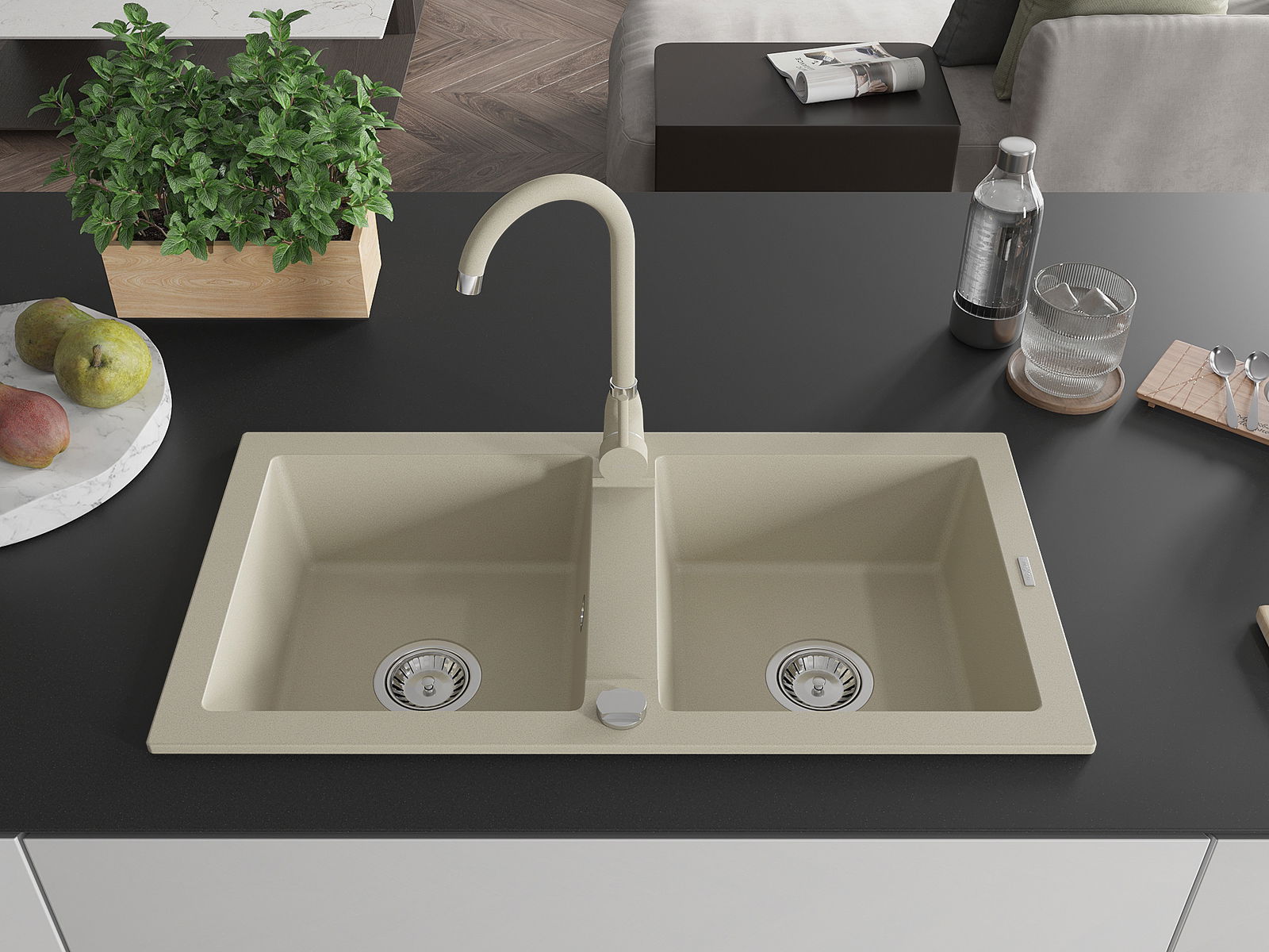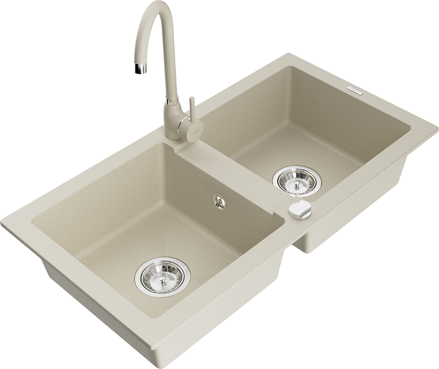 Mexen Mario granitinis dviejų skyrių virtuvinis plautuvas su Telma maišytuvu, smėlio spalvos - 6504-69-670200-69