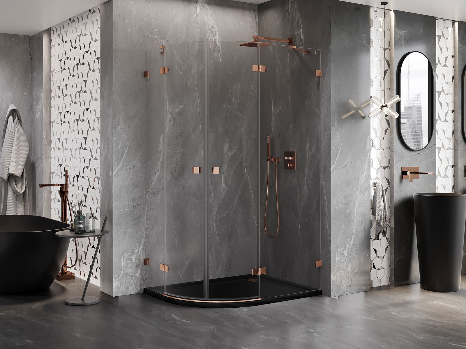 Spaustukai ir vyriai pagaminti iš labai patvaraus žalvario, papildomai sukuriantys lygią stiklo plokštumą. Tai puikus pasirinkimas, jungiantis eleganciją, patvarumą ir šiuolaikinį dizainą. Tokie sprendimai prideda dušo estetikai ir tuo pačiu palengvina švaros palaikymą.
