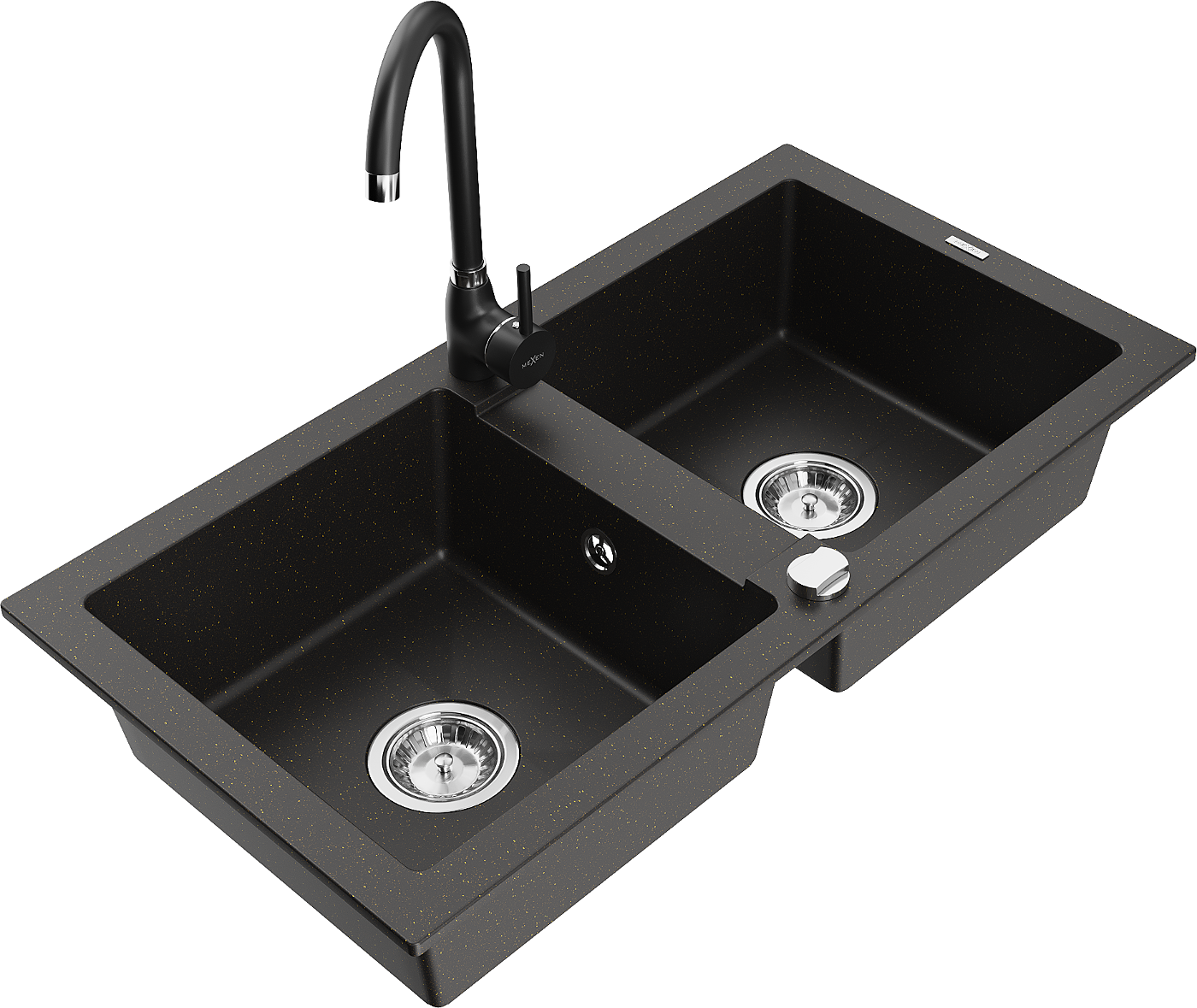 Mexen Mario granitinis dviejų kamerų plautuvė su Telma virtuviniu maišytuvu, juodas/auksinis - 6504-75-670200-70