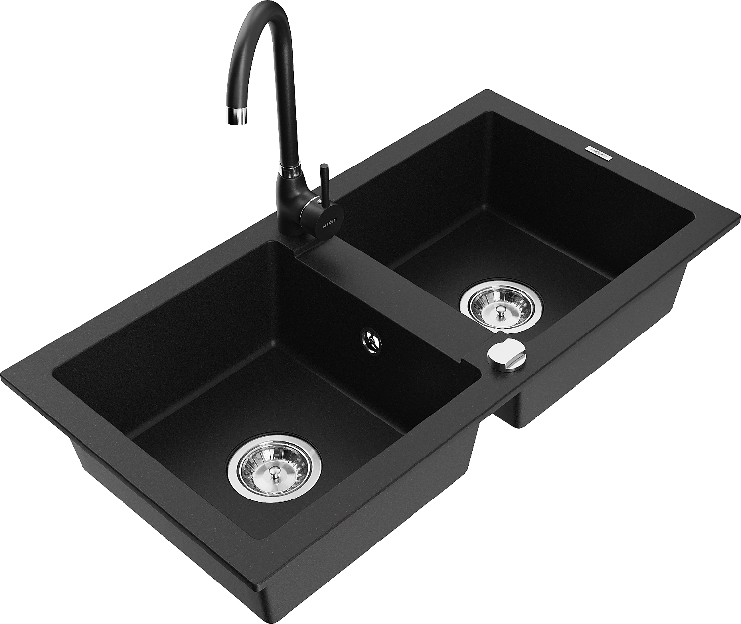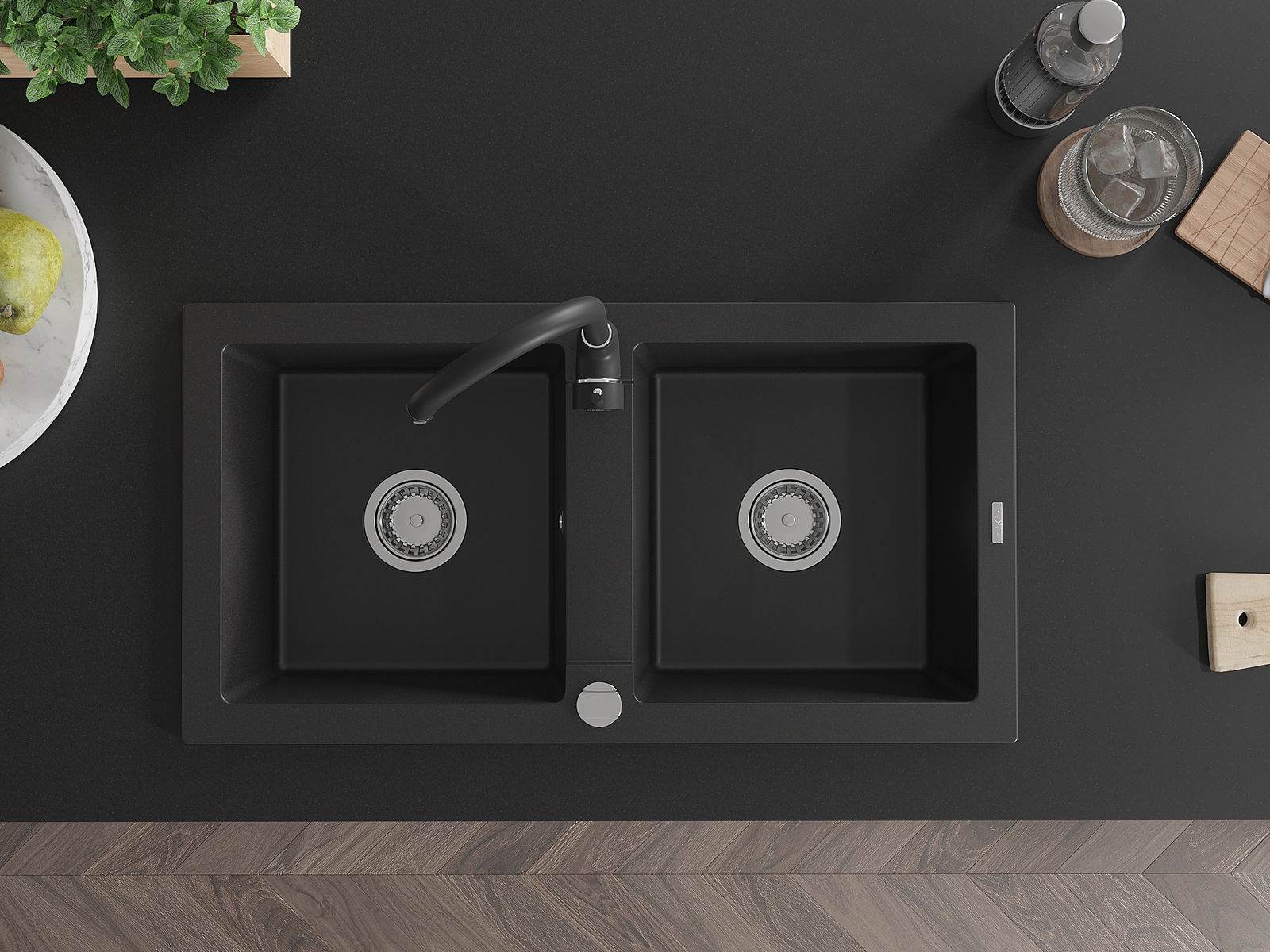 Mexen Mario granitinė 2-jų skyrių plautuvė su virtuviniu maišytuvu Telma, juoda - 6504-77-670200-70