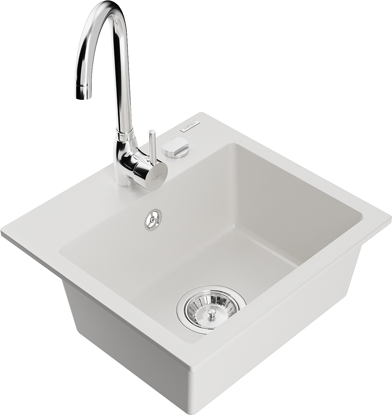 Mexen Milo granitinis virtuvės plautuvės 1 skyrius su virtuviniu maišytuvu Telma, baltas - 6505-20-670200-00