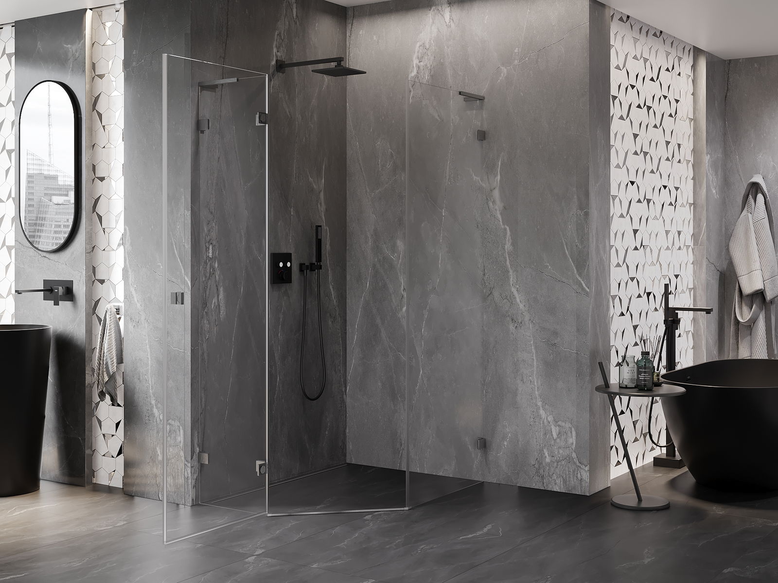 Spaustukai ir vyriai pagaminti iš labai patvaraus žalvario, papildomai sukuriantys lygią stiklo plokštumą. Tai puikus pasirinkimas, jungiantis eleganciją, patvarumą ir šiuolaikinį dizainą. Tokie sprendimai prideda dušo estetikai ir tuo pačiu palengvina švaros palaikymą.