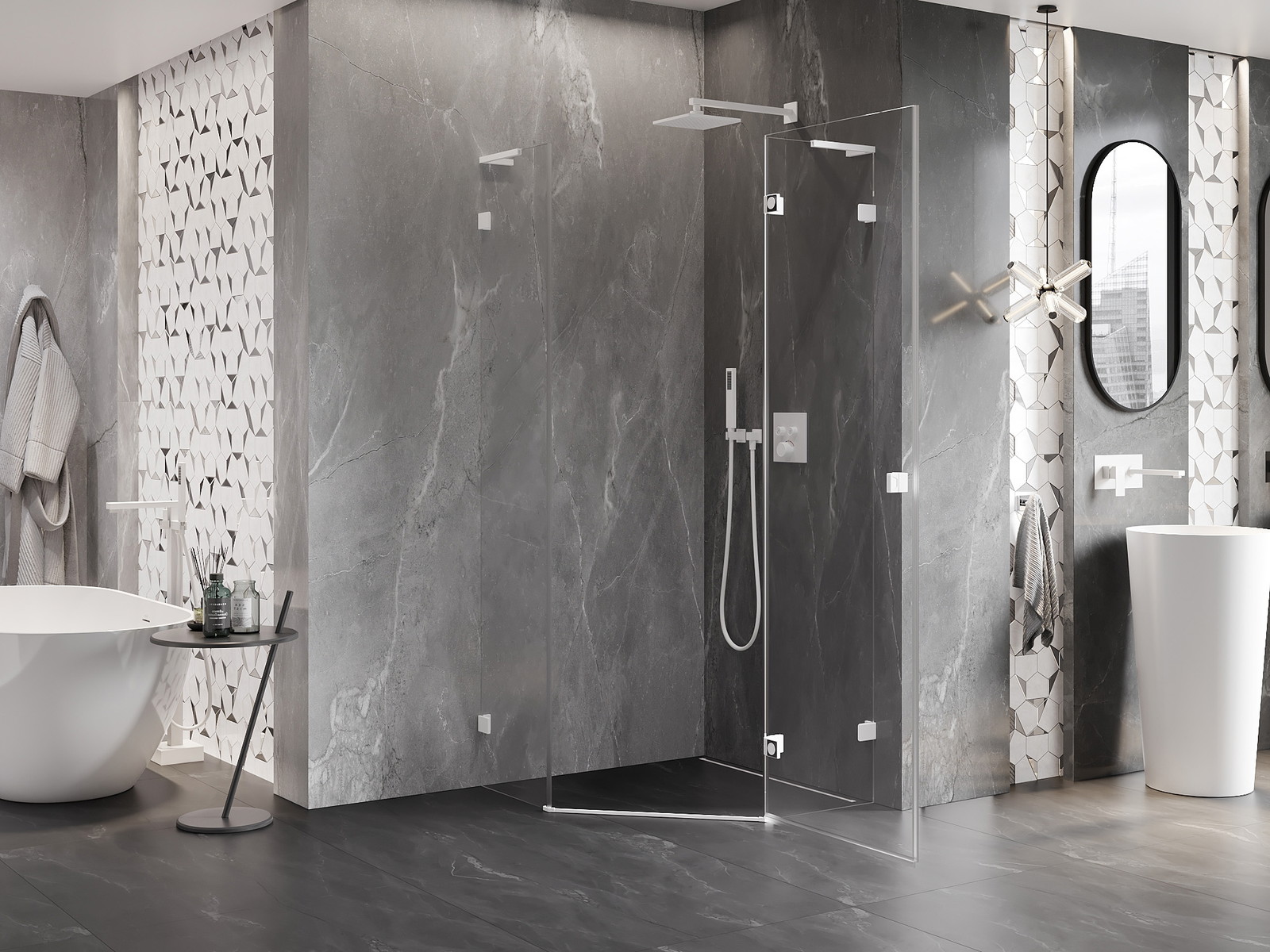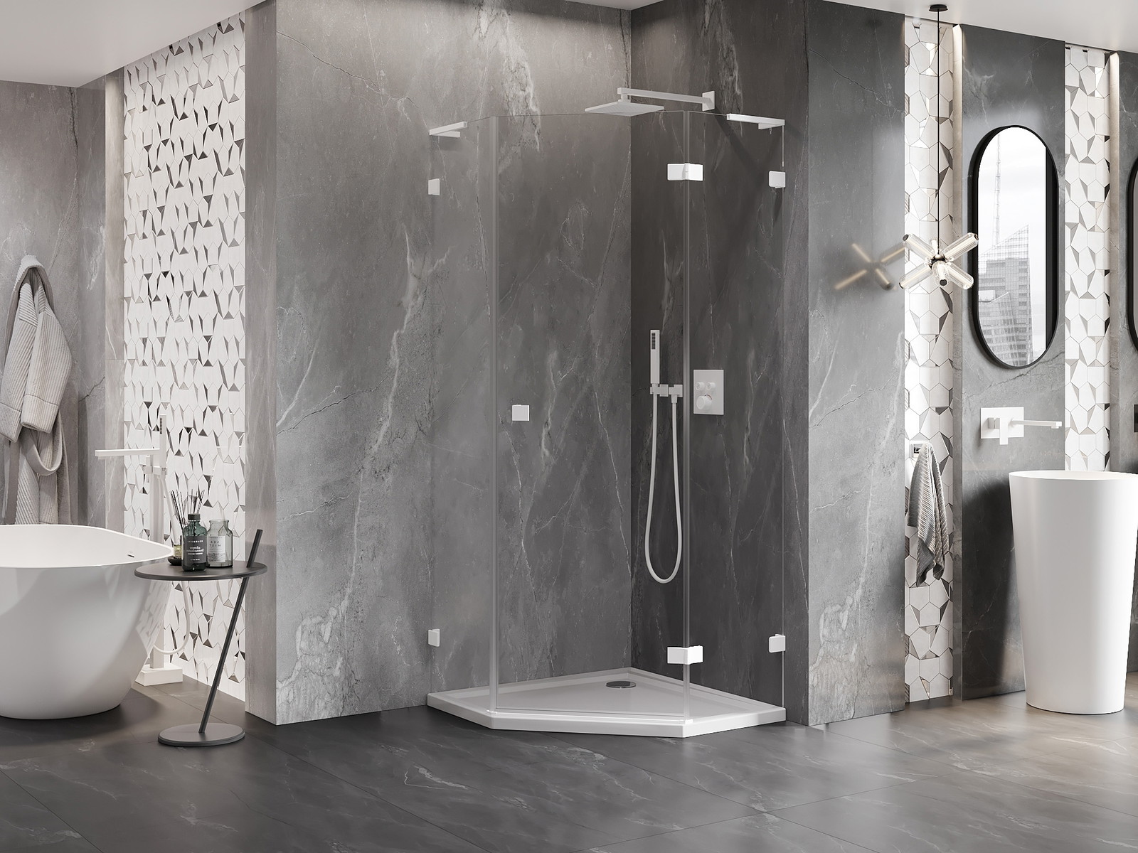Mexen Lunar L yra elegantiška penkiakampė dušo kabina, puikiai tinkanti modernioms vonioms. Siūlo matmenis 90x90 cm, aukštis 200 cm, puikiai dera erdvėje. Tai apima dešinėje esamas atlenkiamas duris ir skaidrų, grūdintą 8 mm storio stiklą su danga, palengvinančia valymą. Patvarus aliuminio profilis ir nerūdijančio plieno stabilizatorius garantuoja ilgaamžiškumą. Galimybė montuoti ant padėklo arba plytelių bei dviejų montavimo sistemų yra papildomi privalumai. Aliuminis slenkstis ir elastomerinės tarpinės užtikrina idealų vandens nuvedimą.