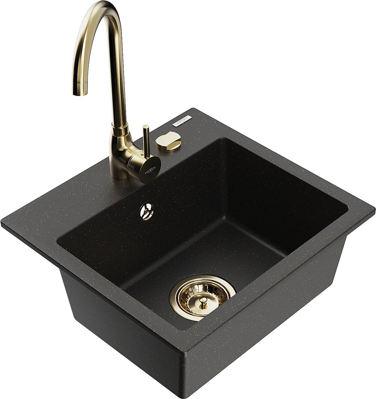 Mexen Milo granito plautuvė vienos kameros su virtuviniu maišytuvu Telma, juodas/auksinis - 6505-75-670200-50