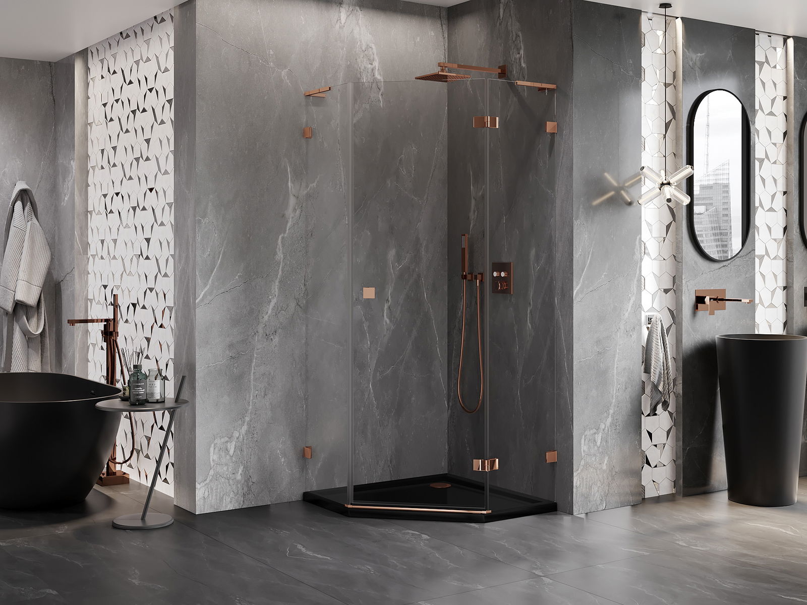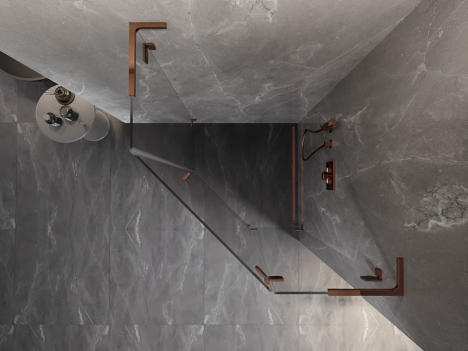 Spaustukai ir vyriai pagaminti iš labai patvaraus žalvario, papildomai sukuriantys lygią stiklo plokštumą. Tai puikus pasirinkimas, jungiantis eleganciją, patvarumą ir šiuolaikinį dizainą. Tokie sprendimai prideda dušo estetikai ir tuo pačiu palengvina švaros palaikymą.