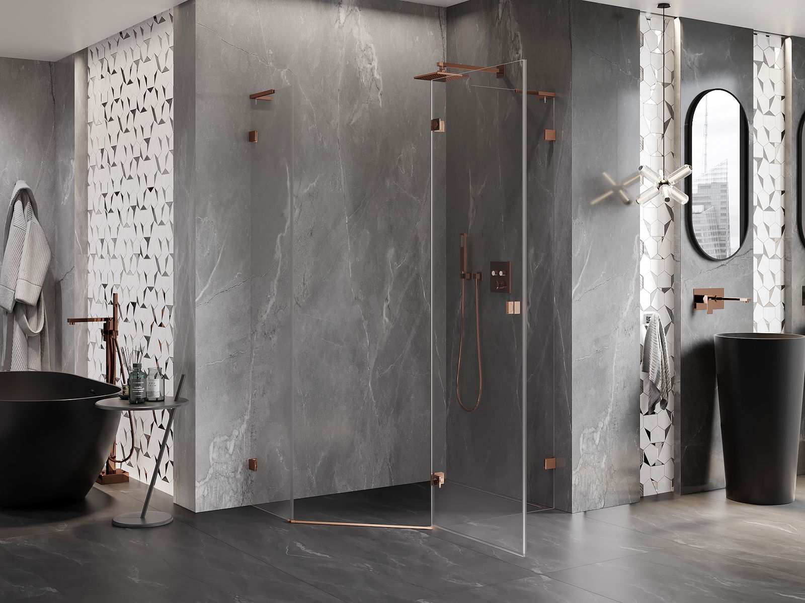 Spaustukai ir vyriai pagaminti iš labai patvaraus žalvario, papildomai sukuriantys lygią stiklo plokštumą. Tai puikus pasirinkimas, jungiantis eleganciją, patvarumą ir šiuolaikinį dizainą. Tokie sprendimai prideda dušo estetikai ir tuo pačiu palengvina švaros palaikymą.