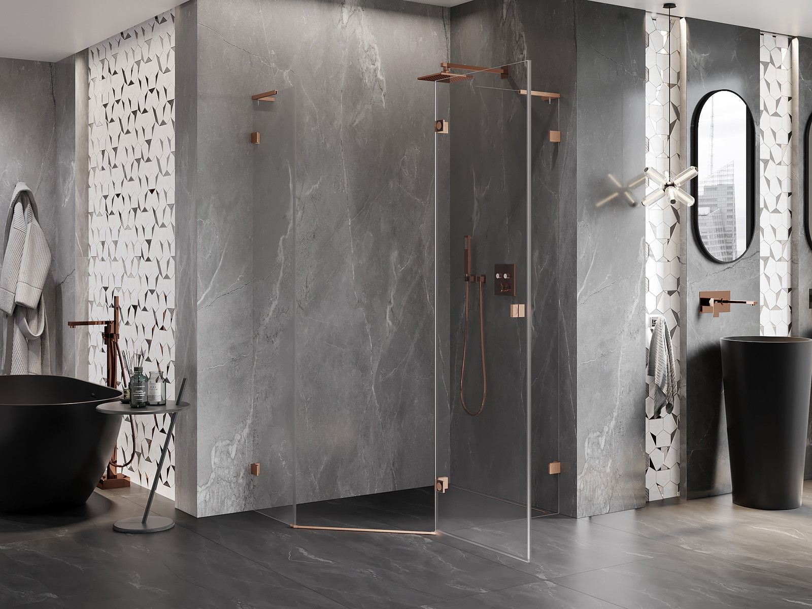 Mexen Lunar L yra šiuolaikinė penkiakampė dušo kabina, jungianti stilių su funkcionalumu. Kompaktiški matmenys 100x90 cm ir 200 cm aukštis užtikrina, kad ji puikiai tiks bet kurioje vonioje. Durys yra atveriamos, o jų pakėlimo ir nuleidimo mechanizmas užtikrina naudojimo komfortą. Skaidrus grūdintas 8 mm stiklas turi paviršių, lengvinantį valymą. Šlifuoto vario apdaila prideda elegancijos. Nerūdijančio plieno ir žalvario elementai garantuoja ilgaamžiškumą. Ploto reguliavimo galimybė ir montavimas tiek ant dušo, tiek ant plytelių suteikia visišką lankstumą. Dvi tvirtinimo sistemos ir magnetinė juosta su elastomeriniais sandarikliais užtikrina puikų sandarumą ir patogumą.