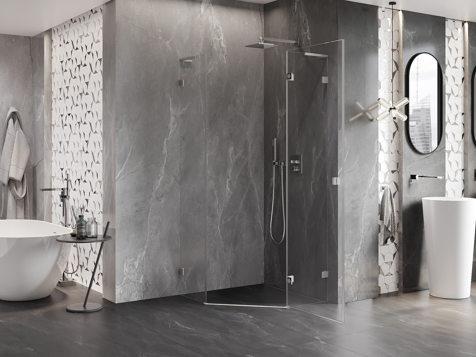 Mexen Lunar L yra elegantiška penkiakampė dušo kabina, kurios matmenys yra 80x80 cm. Ji turi judančias dešinias duris, kurių aukštis yra 200 cm, su skaidriu grūdintu 8 mm stiklu. Dėl lengvai valomos dangos ir aliuminio profilio iš šlifuoto nikelio ji yra efektyvi naudoti. Nerūdijančio plieno kampinis stabilizatorius L ir žalvario rankenos užtikrina patvarumą ir stilių. Galimybė montuoti ant padėklo arba plytelių bei pločio reguliacija daro šį modelį universalų. Magnetinė juosta ir elastomerinės sandarinimo tarpinės neleidžia vandeniui ištekėti, o durų kėlimo ir nuleidimo mechanizmas padidina naudojimo komfortą.