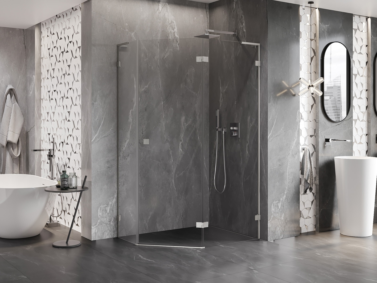 Mexen Lunar L yra aukštos kokybės penkiakampė dušo kabina, kurios matmenys yra 90x80 cm, idealiai tinkanti elegantiškoms vonioms. Pagaminta iš skaidraus grūdinto stiklo, kurio storis yra 8 mm, ir aprūpinta dangomis, palengvinančiomis valymą. Nikeliu šlifuota apdaila bei aliuminio profilis pabrėžia šiuolaikinį dizainą. Kabina suteikia galimybę montuoti ant padėklo arba plytelių, taip pat reguliuoti plotį. Durų pakėlimo ir nuleidimo mechanizmas bei aliuminio tarpiklio slenkstis padidina naudojimo komfortą.